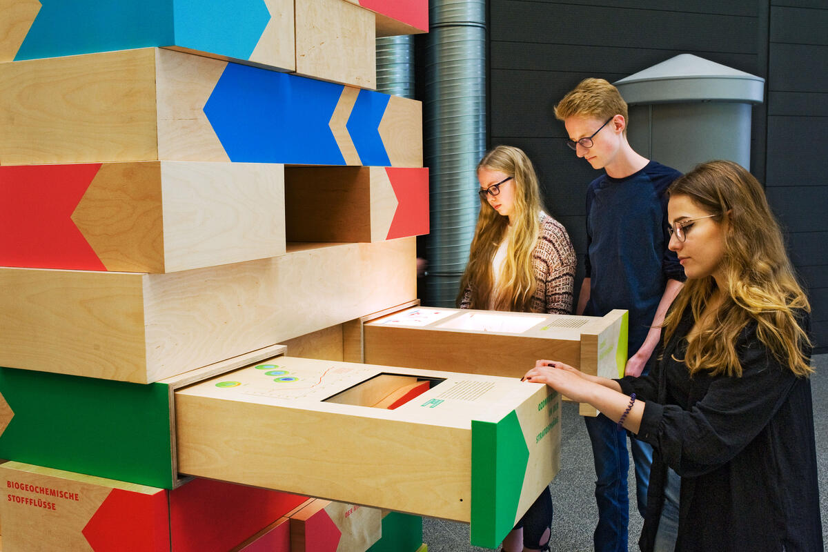 „Um das wissenschaftlich komplexe und schwierige Konzept der ‚planetaren Leitplanken‘ für die Ausstellungsbesucher greifbar zu machen, wartet zunächst ein großer Turm aus Holzklötzen auf die Besucher“, sagt Ulrike Peters, die auf Seiten der DBU die „MenschenWelt“ kuratiert hat. Das Modell mache deutlich: Werde ein Stein herausgezogen, passiere noch nichts. Auch die Erde könne beispielsweise den geringen Verbrauch von natürlichen Rohstoffen noch gut ausgleichen. Aber je mehr Steine entfernt werden, desto wackeliger werde der Turm. In der Wirklichkeit bedeute das: Je mehr endliche Rohstoffquellen wir nutzen oder je mehr Treibhausgase wir ausstoßen, desto stärker verändern wir das Erdsystem, das unsere Lebensgrundlagen liefert. Peters: „Aber wir können auch Klötzchen wieder hineinschieben und das System damit stützen. Zahlreiche Ideen zum Erhalt der Stabilität des Systems Erde finden sich in der Ausstellung.“