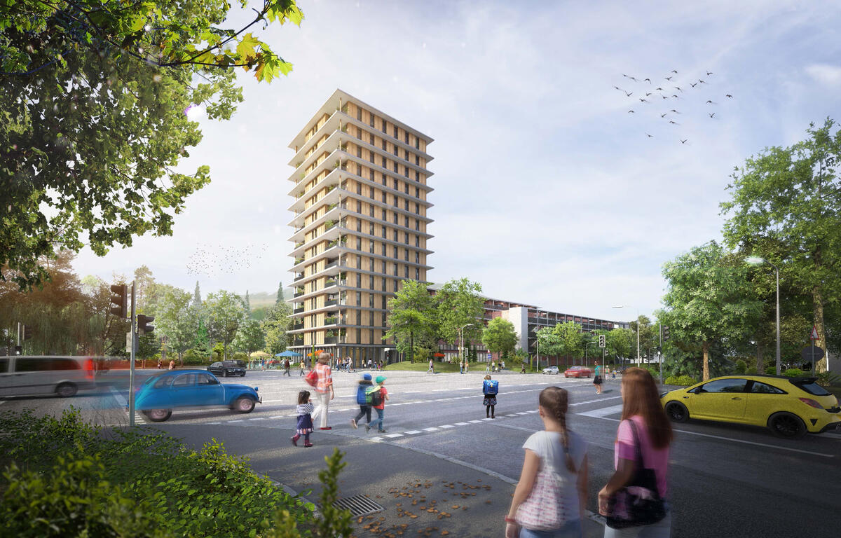Pforzheim. Holz gibt es im Schwarzwald reichlich, Leuchttürme bisher weniger. Das soll sich bald ändern: 14 Stockwerke hoch will die Baugenossenschaft Arlinger in Pforzheim ein Hochhaus mit Namen Carl bauen ‒ und das hauptsächlich aus Holz. „Läuft der Bau erfolgreich, kann er dank seines Modellcharakters ein Leuchtturm für die Holzbaubranche werden. Gleichzeitig wird mithilfe dieses regionalen, nachwachsenden und klimaschonenden Materials dringend benötigter Wohnraum geschaffen“, sagt der Generalsekretär der Deutschen Bundesstiftung Umwelt (DBU), Alexander Bonde, anlässlich der Bewilligungsübergabe zum Projektstart. Die Stiftung fördert das von Peter W. Schmidt Architekten geplante Vorhaben mit 330.700 Euro. In dem insgesamt dreiteiligen Bau – neben dem Hochhaus entstehen außerdem zwei flache Gebäude – sollen Ende 2021 73 Wohnungen, eine Kindertagesstätte für rund 100 Kinder sowie eine Bäckerei mit Café Platz finden. Der Baubeginn ist für Frühjahr 2020 geplant.