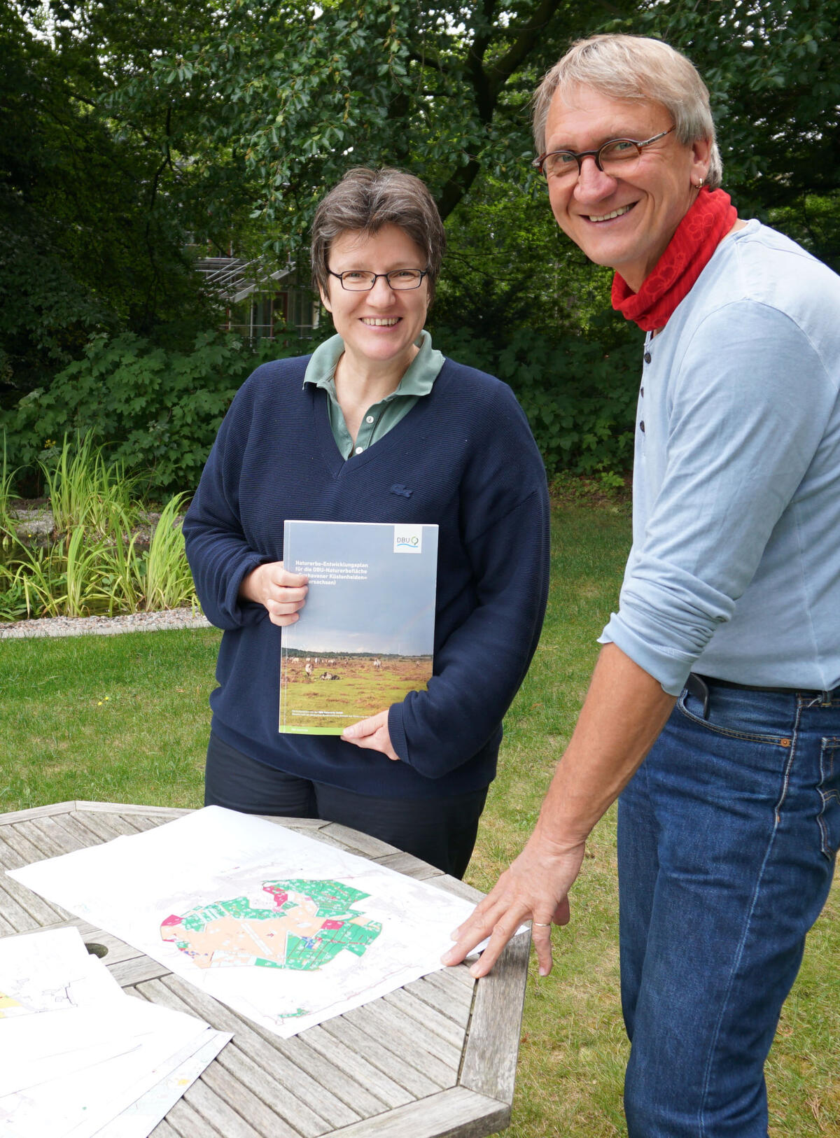 Im Wald stehen die Zeichen auf Veränderung: „Es gibt hier Bestände, da findet man keinen einzigen heimischen Baum – nur Schwarzkiefern, Japanlärchen oder die Traubenkirsche“, weiß PD Dr. Heike Culmsee. Die DBU Naturerbe-Projektleiterin hat in den vergangenen Monaten gemeinsam mit ihrem Team und dem Bundesforstbetrieb Niedersachsen den 165-seitigen Plan entwickelt. Ziel sei es, einen naturnahen Laubmischwald mit standortheimischen Bäumen zu entwickeln, um diesen dann sich selbst zu überlassen. Doch wo kein Samenspender, da kein Laubbaum. „Mit Mitteln der Stiftung ‚Wald in Not‘ konnten wir anders als sonst bei uns üblich auf rund 275 ha junge Buchen unterpflanzen, die den Waldumwandlungsprozess deutlich verkürzen können. Und so wie es aussieht haben sie die Trockenheit im vergangenen Jahr ganz gut überstanden“, erklärt Culmsee und schaut auf die Waldentwicklungskarte im Plan. Bislang seien nur rund 74 ha schon so weit, dass sie dauerhaft aus der Nutzung gehen könnten.
