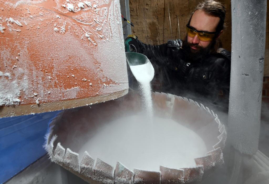 „Eine weitere Möglichkeit ist das Reinigen mittels Eisstrahlen“, erklärt Projektleiter Hannes Nowak vom Unternehmen jenpneumatik & Schlauchtechnik. In diesem gänzlich neuen Verfahren, das mit dem Trockeneisverfahren nichts zu tun hat, sollen die unterschiedlichen Vorteile des Sandstrahl- und des Trockeneisverfahrens verbunden und deren Nachteile verringert werden. „Das Eis schmilzt beim Aufschlag und bindet den Staub. Das abgetragene Material kann so sachgerecht entsorgt, oder wiederverwertet werden und die Arbeitsplatzbelastung wird verringert.“ Stickstoff, der als Treibgas verwendet werde, entweiche in die Atmosphäre, wo er ohnehin mit 80 Prozent Hauptbestandteil der Luft sei.