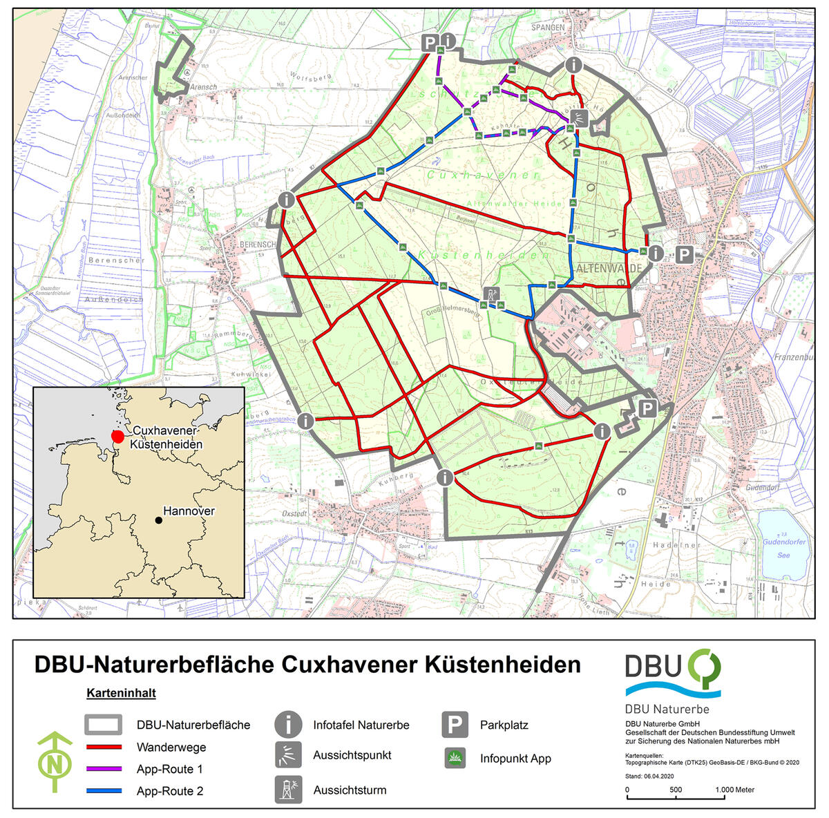 Die Naturerbe-App, die in enger Zusammenarbeit mit dem damaligen Revierleiter Henning Wehebrink und der Firma itour city guide GmbH entwickelt wurde, zeigt für die unterschiedlichen Handy-Betriebssysteme zwei Routen durch die Cuxhavener Küstenheiden, die zu Fuß oder mit dem Rad entdeckt werden können. Der große Küstenrundweg ist neun Kilometer lang, der kleine Rundweg zweieinhalb. Eine Benachrichtigung erscheint am Smartphone, wenn Wanderer einen interessanten Punkt erreichen. Mit einem Klick erläutern „Besucherin Anette und Förster Sven“ in einem lockeren Dialog spannende Hintergründe zur heimischen Tier- und Pflanzenwelt sowie der strategischen Naturschutzarbeit. „Die Audiobeiträge sind in der Regel nicht länger als zwei Minuten“, so Susanna Rietschel, Produzentin der Firma itour city guide GmbH, die die Audioführungen sowie Inhalte in Zusammenarbeit mit einem Redaktionsteam, Drehbuchautoren sowie dem Bundesforstbetrieb Niedersachsen für das DBU Naturerbe erarbeitet hat. Die technische Umstellung der Naturerbe-App wird zeitgleich auch für die bestehenden Audioführungen auf allen anderen Naturerbeflächen wie der Wahner Heide und Prora vorgenommen.
