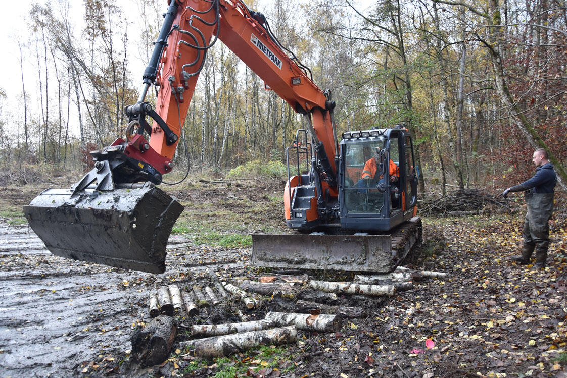 Bevor ein Bagger anrückte, mussten Kampfmittelexperten aber zuerst die Fläche nach Altlasten sondieren. „Gar nicht so einfach bei bis zu 75 Zentimetern Schlamm. Irgendwann sind wir dann auf die Idee gekommen, eine Schlickrutsche zu bauen, wie sie im Wattenmeer eingesetzt wird“, so Conrady, der sich an seine Jugend in der Nähe der Nordseeküste erinnerte. Mit Hilfe von Tonnen und Seilen haben die Experten ihre Geräte so über den Schlamm gezogen. Kampfmittel fanden die Sondierer glücklicherweise nicht – nur alte russische Panzerketten. Im Anschluss bahnte sich ein Bagger über die provisorisch angelegte Strecke seinen Weg zum Weiher. „Er hat den Teich etwas vergrößert. Letztlich haben wir rund 300 Kubikmeter Schlamm abgebaggert und eine wasserabdichtende Deckschicht zur Sicherung des Dammes ausgelegt“, weiß Fuellhaas. Am Grund entdeckten die Naturschützer eine schwach schüttende Quelle, die für einen ausreichenden Wasserzulauf im Teich sorgen wird.