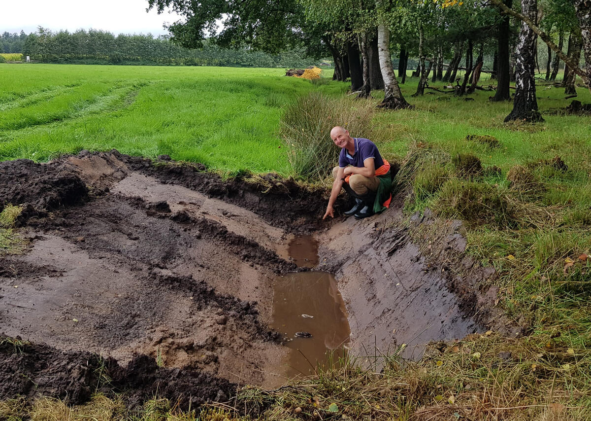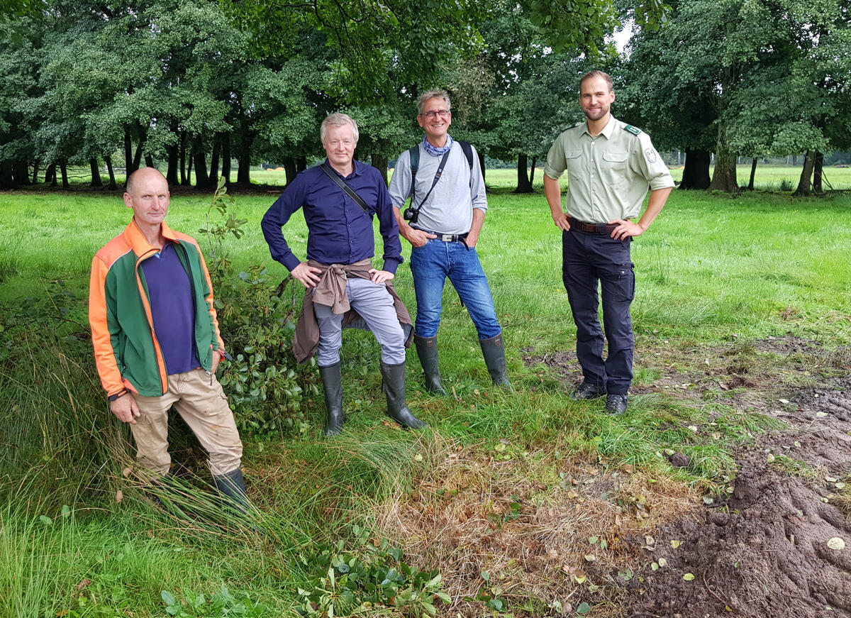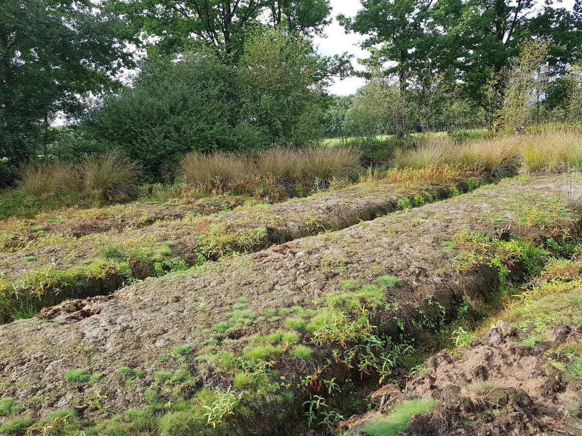 Alle zweieinhalb Meter ist das Süskenbrocksmoor durch parallel verlaufende Gräben durchzogen, so dass es als Moor kaum noch zu erkennen ist. Traurig trocken wirkt der Boden, längst bröselt der mineralisierte Torf wie lockere Erde durch die Finger. Der nasse Torf ist rund 30 Zentimeter unter der Bodenoberfläche noch da, aber seine Mächtigkeit wird immer kleiner. „Wir gehen davon aus, dass die wasserhaltende Schicht durch die Gräben im Moor zerschnitten wurde“, erklärt Dr. Uwe Fuellhaas, Gewässer- und Feuchtgebietsmanager im DBU Naturerbe. Vereinzelte Lehm-Plomben in der Torffläche könnten daher das nötige Wasser nicht in der Landschaft halten, weil es in den Gräben nach unten entweicht. Daher hat Gärtnermeister Breitkopf jetzt die Entwässerungsgräben auf den angrenzenden Feuchtwiesen nördlich vom Moor verschlossen. Fuellhaas: „Gemeinsam mit dem Naturschutzzentrum Kreis Coesfeld, die diese Maßnahme durchführen und mitfinanzieren, wollen wir das Grundwasser dort so anstauen, dass es von unten in den Torfboden drückt.“ Ob die rund 90 Plomben in den Entwässerungsgräben die erhoffte Wirkung entfalten, werde nächsten Sommer klar. „Schön wäre es, wenn auf der Wiese hier bis in den Frühling das Wasser steht. Dann dürfte der Grundwasserspiegel hoffentlich so angestaut sein, dass sich das Wasser im Süskenbrocksmoor bis weit in den Sommer hält“, so Matthias Olthoff vom Naturschutzzentrum Kreis Coesfeld. Selbst wenn sich der Zustand des Lebensraumes so stabilisiert und bestenfalls erholt – es bleibt ein Tropfen auf dem heißen Stein. Olthoff: „Das Moor war hier früher rund 4.000 Hektar groß“. Längst ist es weit über die DBU-Naturerbefläche Borkenberge hinaus forst- und landwirtschaftlich überprägt.