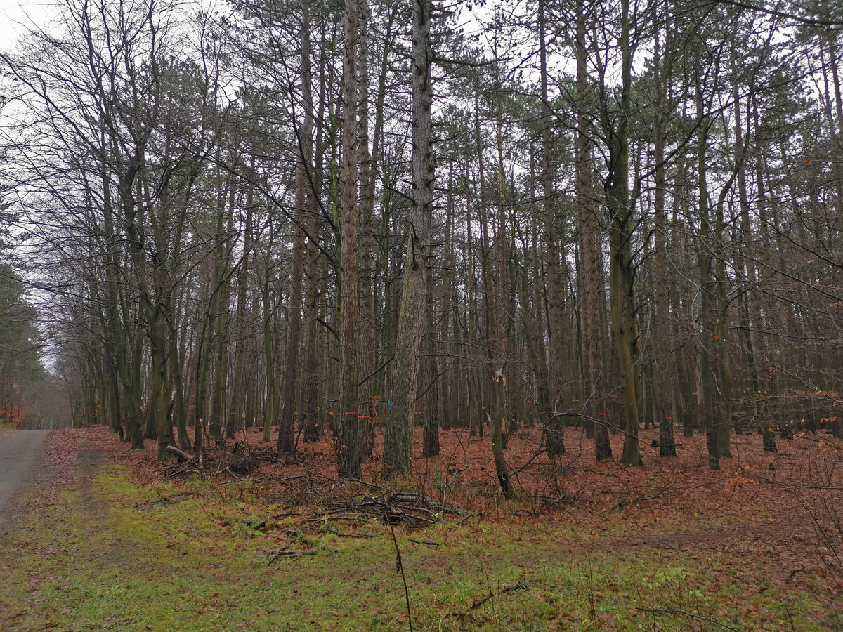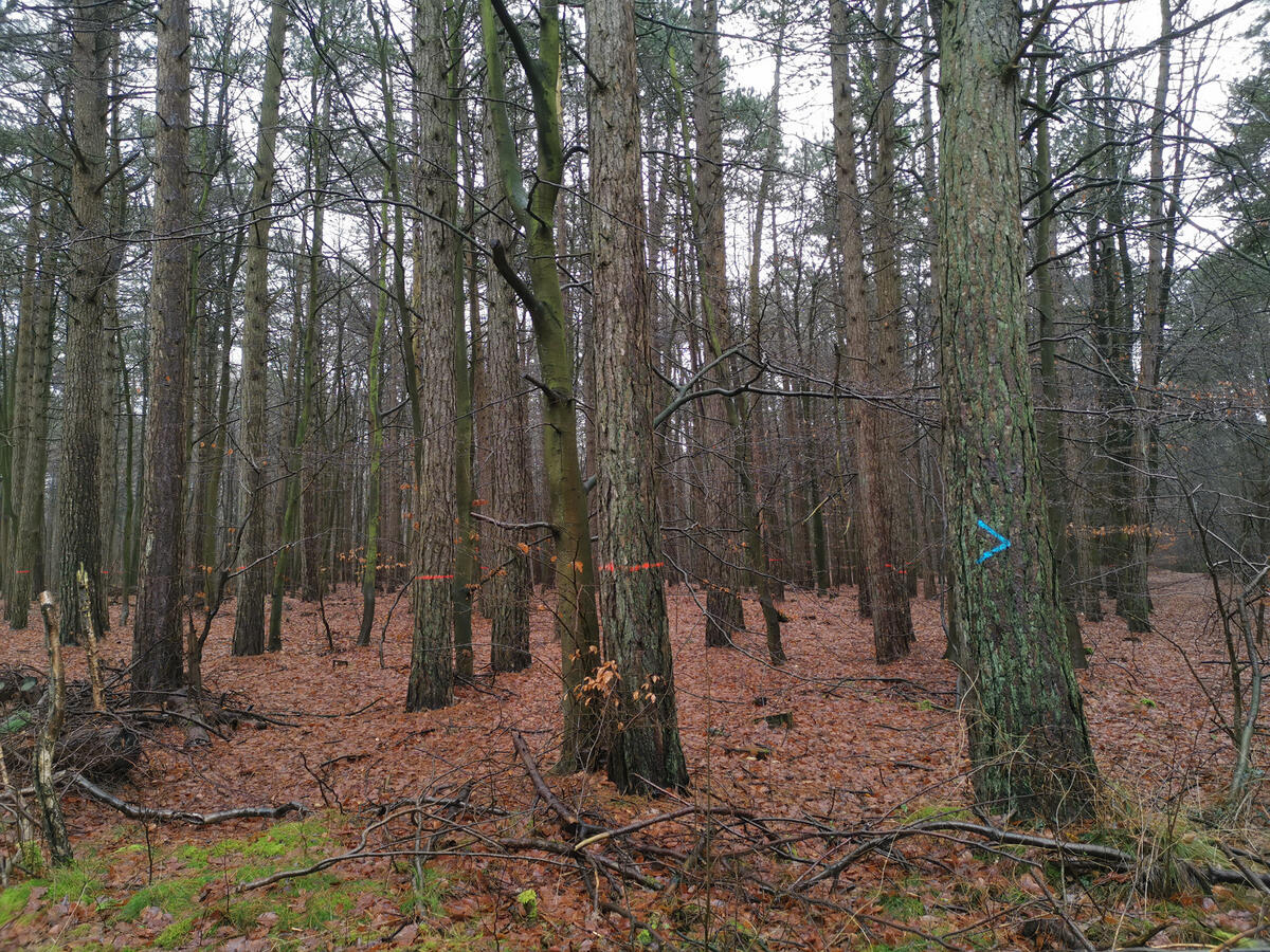 „Heute beginnt eine große Naturschutzmaßnahme auf der DBU-Naturerbefläche Cuxhavener Küstenheiden: Ein beauftragtes Forstunternehmen wird standortfremde Baumarten wie Schwarzkiefer, Sitkafichte, Spätblühende Traubenkirsche, Japanlärche und vereinzelte Roteichen entnehmen“, erklärt Revierleiter Dominik Sucker-Weiß vom Bundesforstbetrieb Niedersachsen. Im Auftrag des DBU Naturerbes betreut er die DBU-Naturerbefläche vor Ort. Als standortfremd werden Gehölze bezeichnet, die nicht natürlicherweise in den Küstenheiden vorkommen. Sie wurden vom Menschen eingebracht und wachsen im Vergleich zu den heimischen Laubbäumen wie der Buche besonders schnell. „Das führt aber dazu, dass Buchen und Eichen wenig Licht und Raum bekommen“, so der Förster. Anders als in Wirtschaftswäldern wollen DBU Naturerbe und Bundesforst neben den heimischen Baumarten auch besonders knorrige und krumme Bäume freistellen, denn „in Astlöchern und Nischen finden beispielsweise Vögel und andere Kleintiere ihre Bruthöhlen und Lebensräume“, sagt Sucker-Weiß.