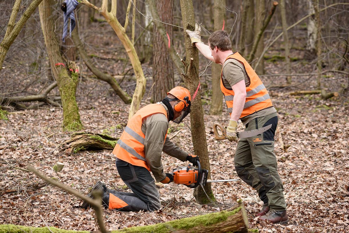 Oberasbach. 14 freiwillige Helferinnen und Helfer aus ganz Deutschland nutzen ihre Freizeit, um sich im praktischen Naturschutz zu engagieren: Vom 13. bis zum 19. Februar ist der Verein Bergwaldprojekt zu Gast auf der DBU-Naturerbefläche Hainberg in der Nähe von Fürth. Eine Woche lang leisten die Teilnehmenden einen persönlichen Beitrag, um dort beispielsweise die Spätblühende Traubenkirsche zu bekämpfen. Mit den aktuellen Problemen der Ökosysteme vor Augen soll der Einsatz die Freiwilligen auch für eine nachhaltige Lebensweise in ihrem Alltag sensibilisieren.