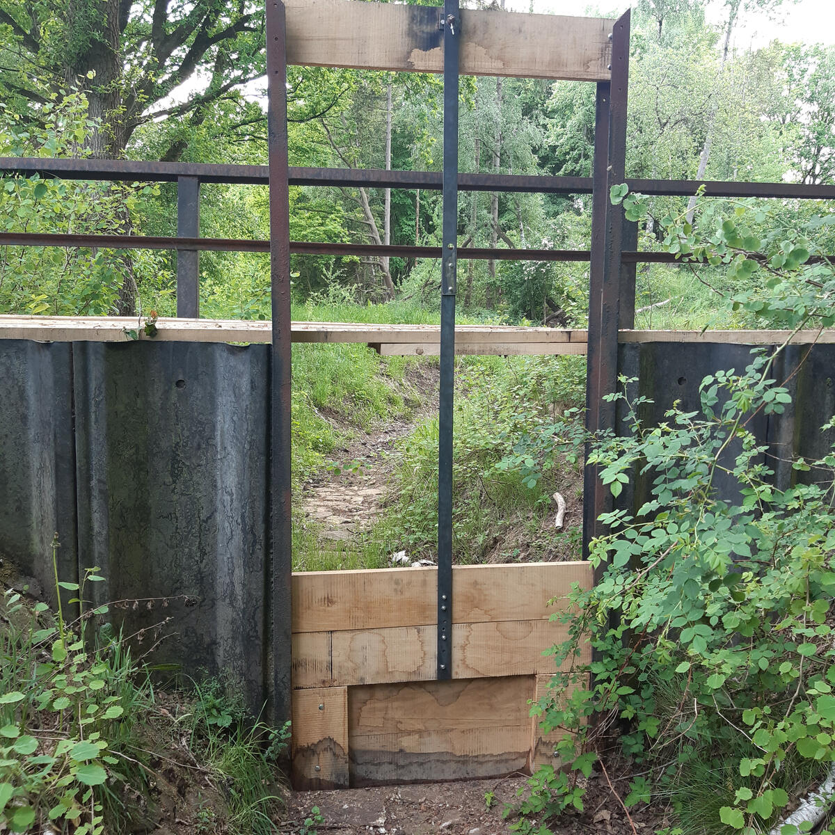 „Vor rund 100 Jahren gab es hier eine aktive Bewässerung durch Schöpfwerke am Mittelandkanal. Diese historische Bewirtschaftungsform erschien irgendwann unnötig und wurde aufgegeben, doch die alten Stauwerke lassen sich teils noch gut reaktivieren“, weiß Bundesforst-Revierleiter Rainer Schmidt. In Abstimmung mit dem Kreis Steinfurt haben Mitarbeiter des Unterhaltungsverbandes Düsterdieker Aa Eichenbohlen und Eisenschläge in einem ersten alten Stauwehr im Vogelpohlgraben erneuert. Weitere sollen folgen. „Die Stauwehre sind grundsätzlich durch Schieber regelbar, so dass wir nötigenfalls auch Wasser ablassen könnten“, so Schmidt. Geplant ist das in dieser niederschlagsarmen Zeit aber nicht. Schließlich sollen die selten gewordenen Feuchtwiesen in dem europäisch geschützten Gebiet von dem angestauten Grabenwasser profitieren. Aufgrund der ehemaligen militärischen Nutzung sind die Flächen über einen langen Zeitraum nicht gedüngt worden und daher von großem Wert für den Naturschutz. Fuellhaas: „Lebensraumschutz ist immer auch Artenschutz. Einigen Vogelarten wie dem Wiesenpieper, der in Feuchtwiesen brütet, helfen wir mit der Maßnahme.“