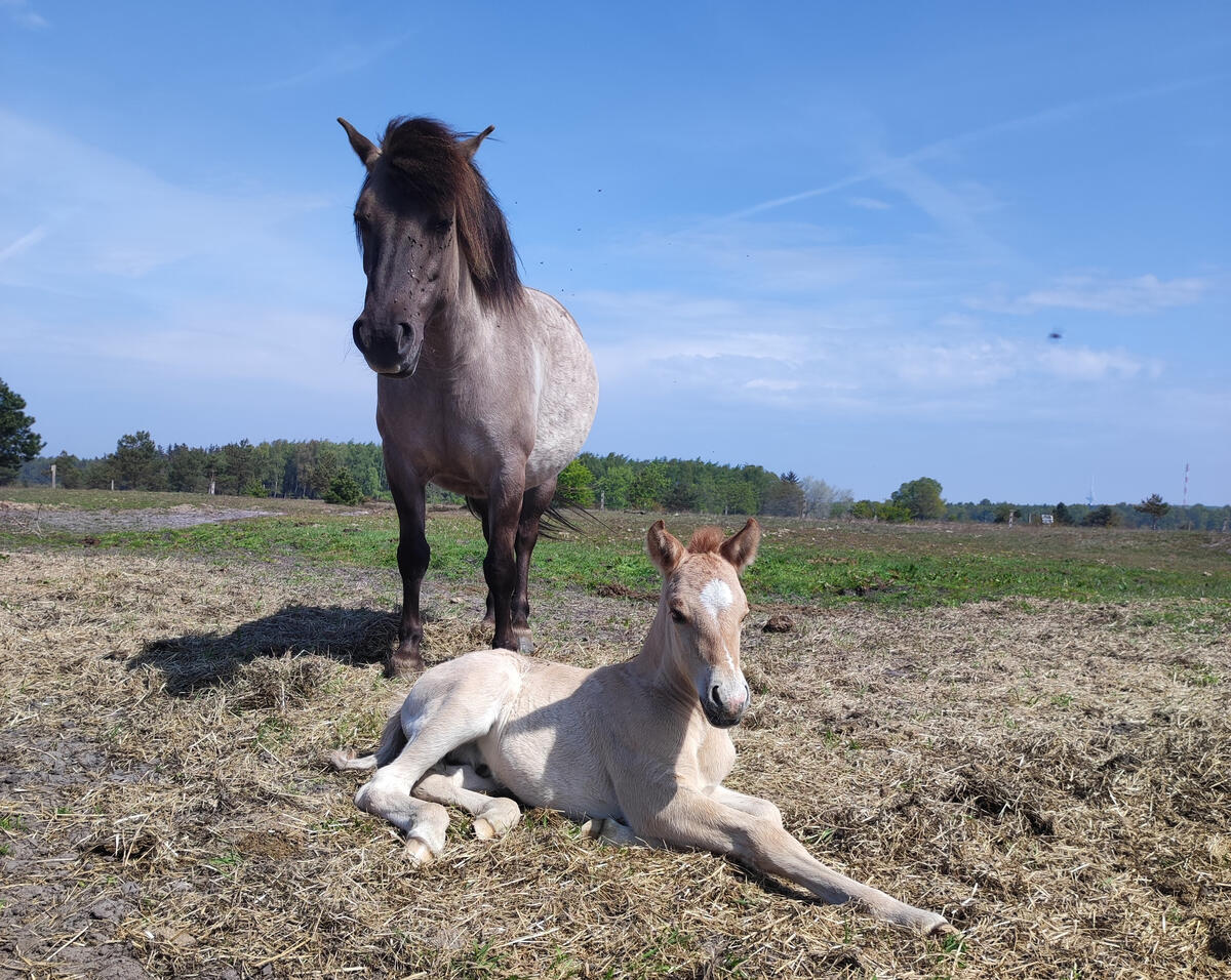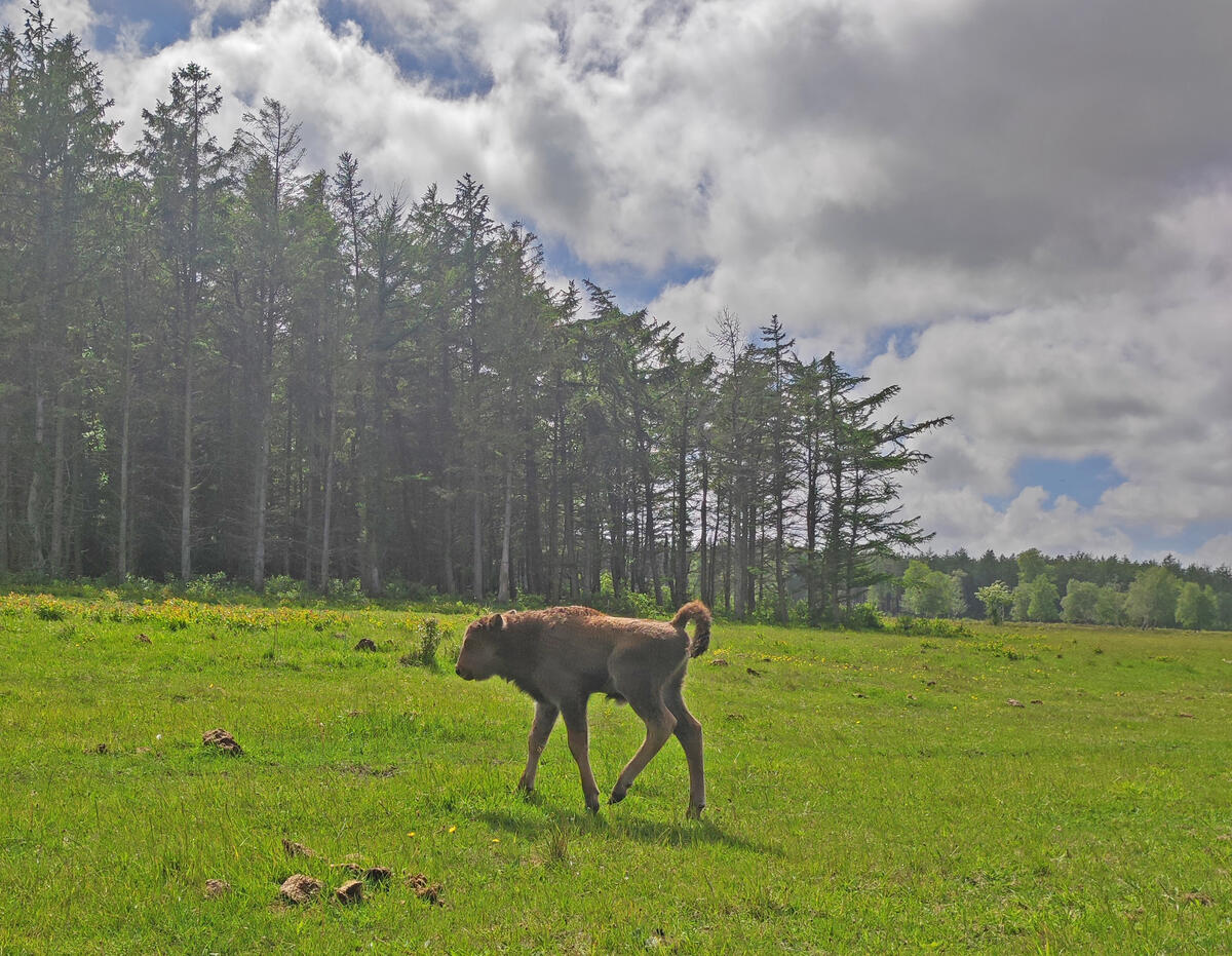 Noch etwas wackelig stolpert der junge Wisentbulle über das Offenland der DBU-Naturerbefläche Cuxhavener Küstenheiden. Auch in der Konikherde hat es bereits Nachwuchs gegeben: Im Mai sind insgesamt drei Hengste und zwei Stuten geboren. „Wir freuen uns sehr über den Nachwuchs unserer tierischen Landschaftspfleger. Die Tiere leisten auf der Fläche einen wichtigen Beitrag zum Naturschutz, indem sie mit ihrem Appetit die offene Landschaft erhalten“, sagt Dr. Jörg Tillmann, stellvertretender Leiter im DBU Naturerbe, einer gemeinnützigen Tochtergesellschaft der Deutschen Bundesstiftung Umwelt (DBU). Die Wisente und Konikpferde beweiden neben Rindern ganzjährig rund 345 Hektar Offenland. Arne Hasenkampf hat als Pächter dabei ein Auge auf seine Tiere.