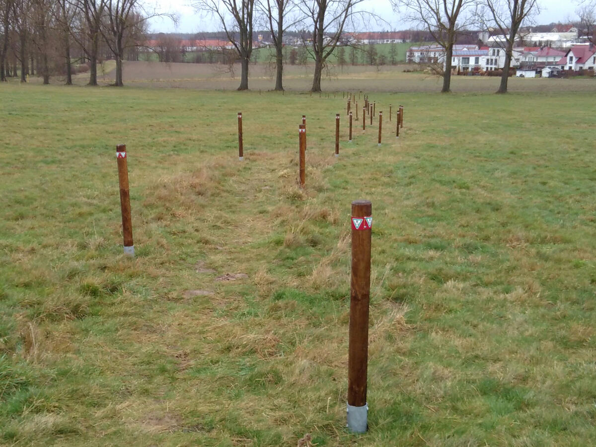 Begrenzungspfähle der Wege und Hinweisschild zum Naturschutzgebiet werden wieder ersetzt