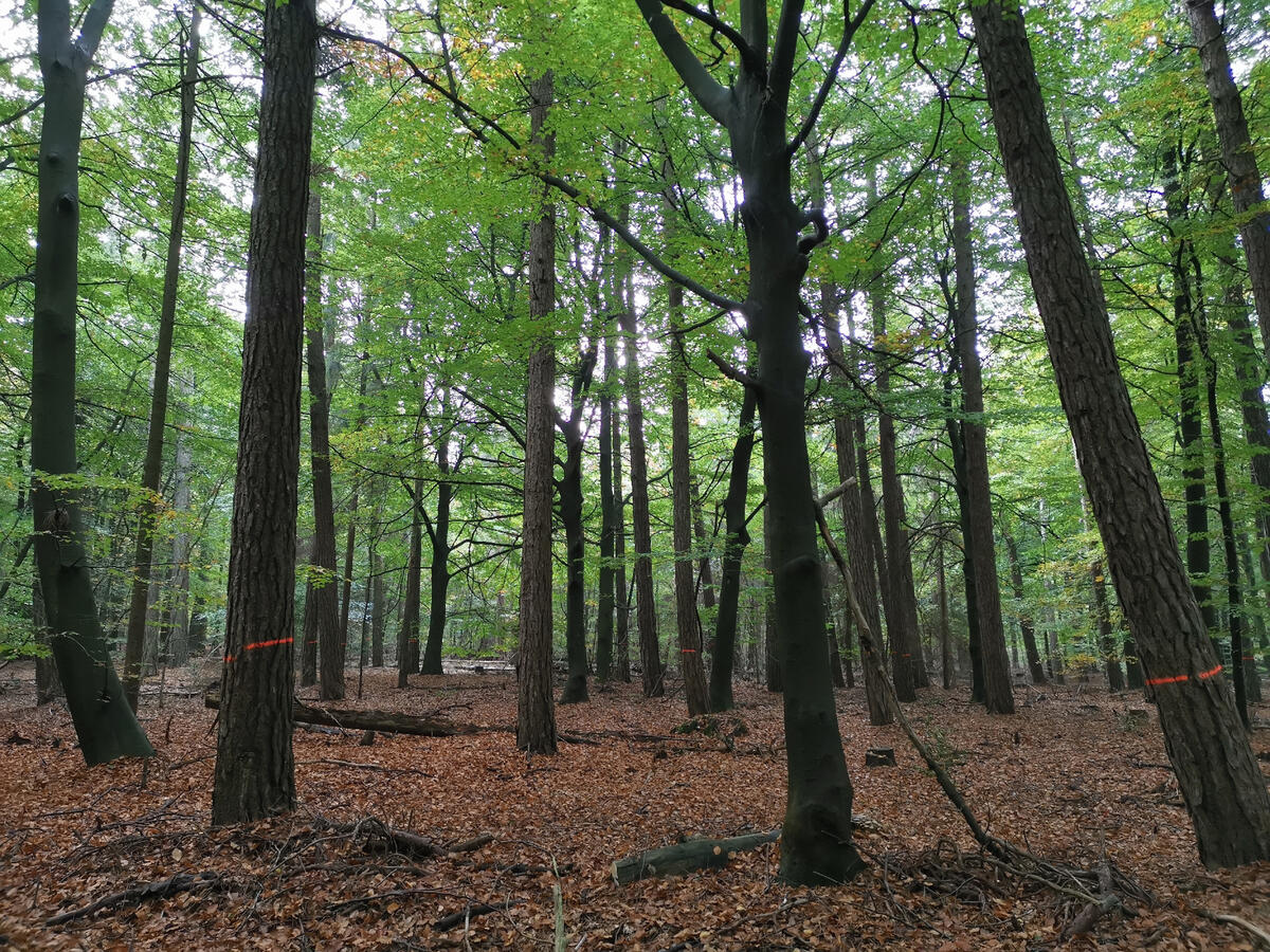 „Heute beginnt eine große Naturschutzmaßnahme auf der DBU-Naturerbefläche Cuxhavener Küstenheiden: Ein beauftragtes Forstunternehmen wird standortfremde Baumarten wie Schwarzkiefer, Sitkafichte, Spätblühende Traubenkirsche, Japanlärche und vereinzelte Roteichen entnehmen“, erklärt Revierleiter Dominik Sucker-Weiß vom Bundesforstbetrieb Niedersachsen. Im Auftrag des DBU Naturerbes betreut er die DBU-Naturerbefläche vor Ort. Als standortfremd werden Gehölze bezeichnet, die nicht natürlicherweise in den Küstenheiden vorkommen. Sie wurden vom Menschen eingebracht und wachsen im Vergleich zu den heimischen Laubbäumen wie der Buche besonders schnell. „Das führt aber dazu, dass Buchen und Eichen wenig Licht und Raum bekommen“, so der Förster. Anders als in Wirtschaftswäldern wollen DBU Naturerbe und Bundesforst neben den heimischen Baumarten auch besonders knorrige und krumme Bäume freistellen, denn „in Astlöchern und Nischen finden beispielsweise Vögel und andere Kleintiere ihre Bruthöhlen und Lebensräume“, sagt Sucker-Weiß.