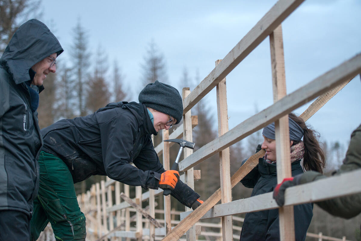 Dieses Mal stehen heimische Laubbäume im Fokus: Die Teilnehmerinnen und Teilnehmer aus ganz Deutschland bauen flexible Schutzzäune aus Holz, um die aufwachsenden Buchen und Eichen vor Wildverbiss zu schützen. „Dort wo Nadelholz aufgrund der Trockenheit abgestorben ist oder wegen Borkenkäferbefall gefällt wurde, wachsen nun junge Laubmischwälder aus Sämlingen auf. Diese Naturverjüngung unterstützen wir, indem wir sogenannte Hordengatter errichten“, erklärt Revierleiter Jens-Eckard Meyer vom Bundesforstbetrieb Reußenberg. Mit vier Meter langen Holzlatten werden Zaunelemente errichtet und um die aufwachsenden Jungbäume gestellt. „Die freiwilligen Helferinnen und Helfer leisten hier harte Arbeit“, stellt Meyer fest. Arbeit, die sich lohnt: So entstehe ein Laubmischwald, der zukünftig besser für Klimawandelfolgen wie Trockenheit und Kalamitäten gerüstet ist.