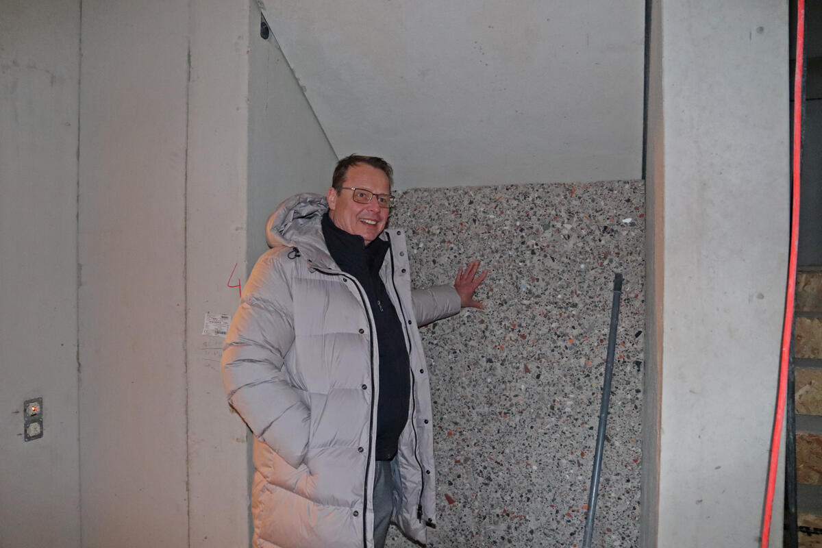 Dass die Wände aus Natursteinersatz im seriellen und kostengünstigen Wohnungsbau eingesetzt werden können, wollten die Brüder selbst beweisen. Nur fünf Fahrminuten vom produzierenden Unternehmen entfernt haben sie neu gebaut – ein Drei-Parteien-Miethaus, bei dem alle Innenwände aus 100 Prozent Recycling-Beton bestehen. „Durch dieses Haus können wir auch zeigen, dass unsere Wände den herkömmlichen qualitativ ebenbürtig sind“, sagt Wolfgang Büscher. Der Enthusiasmus ist ihm anzumerken. Er weist im Eingangsbereich auf eine bewusst sichtbar gebliebene Wand aus Mauerwerkabbruch. Deutlich zu sehen: rote Bruchsteine und grauer Beton. Alle anderen Innenwände sind so unauffällig hellgrau wie man es von Beton kennt. Neben eingesparten Ressourcen und Treibhausgasen gibt es einen anderen Vorteil im Vergleich zu einem Neubau mit gemauerten Wänden: die kürzere Bauzeit. „In zwei Wochen hat der Rohbau gestanden“, sagt Hans-Jürgen Büscher. Der Grund: Die Innenwände konnten individuell vorgefertigt werden. Nach kaum vier Monaten Bauzeit ist das Recyclinghaus nun bezugsfertig. Am 1. Februar wird zum Empfang geladen – mit dabei: der ehemalige DBU-Kurator Jens Spahn.