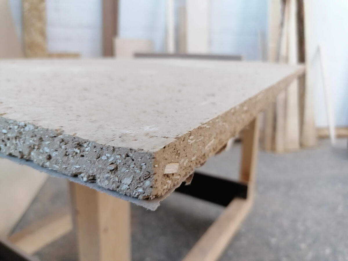 Baulehm aus der Kiesgrube und gehäckselter Chinaschilf machen Platte
