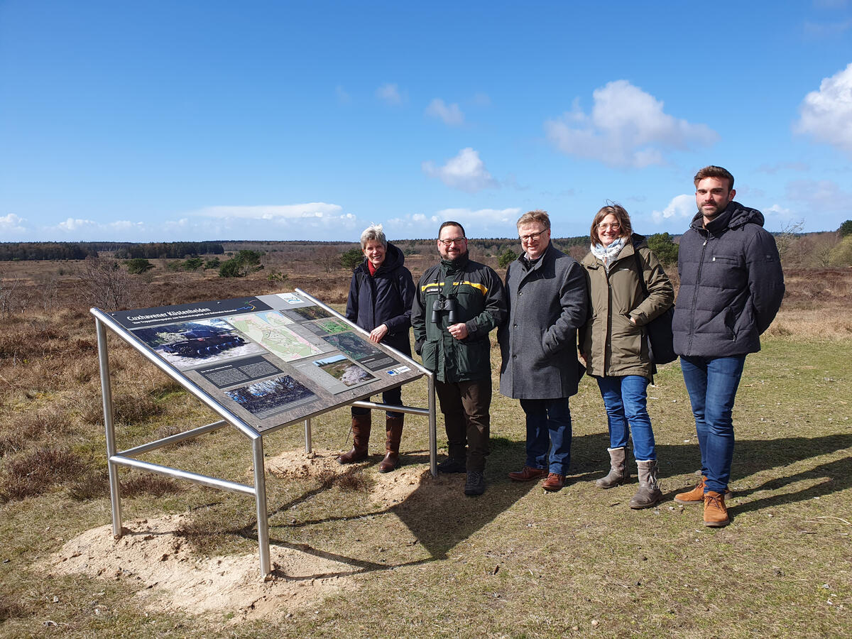Wer mit dem Rad, zu Fuß oder auf dem Pferd in der DBU-Naturerbefläche unterwegs ist, findet sich nun leicht zurecht. Eine neue Wegebeschilderung zeigt Verbindungen und Entfernungen zwischen den Ortsteilen Holte-Spangen, Altenwalde, Berensch und Oxstedt auf. Für alle, die sich weiter über die Fläche und ihre Lebensräume informieren möchten, lädt eine elf Kilometer lange Themenroute sowie ein vier Kilometer langer Entdeckerpfad zum Erkunden ein. Zwölf Thementafeln geben Einblicke zum Beispiel in die Entstehungsgeschichte der Heide durch Menschenhand, die Rolle des Militärs, die Beweidung mit großen Pflanzenfressern, den Wald im Wandel und den Lebensraum Moor. „Wir nehmen das ganze Spektrum der Lebensräume einmal unter die Lupe und haben beim kürzeren Entdeckerpfad vor allem an Familien und unsere jungen Besucherinnen und Besucher gedacht“, erklärt Kathrin Wiener, Projektverantwortliche im DBU Naturerbe. Die bunt gestalteten Entdeckertafeln laden an zehn Stationen dazu ein, die Geschichte der Landschaft und die Welt der Pflanzen und Tiere zu erkunden. Auch die Themen Moorschutz und biologische Vielfalt werden veranschaulicht. Wer gerne rätselt und mit dem Smartphone unterwegs ist, kann sein erlangtes Wissen direkt an jeder Entdeckerstation über einen QR-Code bei der digitalen Wissensrallye auf die Probe stellen. Hier geht es darum, Fragen zu beantworten, Vogelstimmen zu erkennen und Baumarten zu erraten. „Die Cuxhavener Küstenheiden sind ein Besuchermagnet in unmittelbarer Nähe zum Nationalpark Wattenmeer“, betont Uwe Santjer, Oberbürgermeister der Stadt Cuxhaven. Die neue Wege- und Informationsbeschilderung biete Orientierung und gleichzeitig einen Mehrwert für alle Erholungssuchenden und Naturinteressierten – ein attraktives Angebot für Gäste und Ortsansässige Cuxhavens und der Region.
