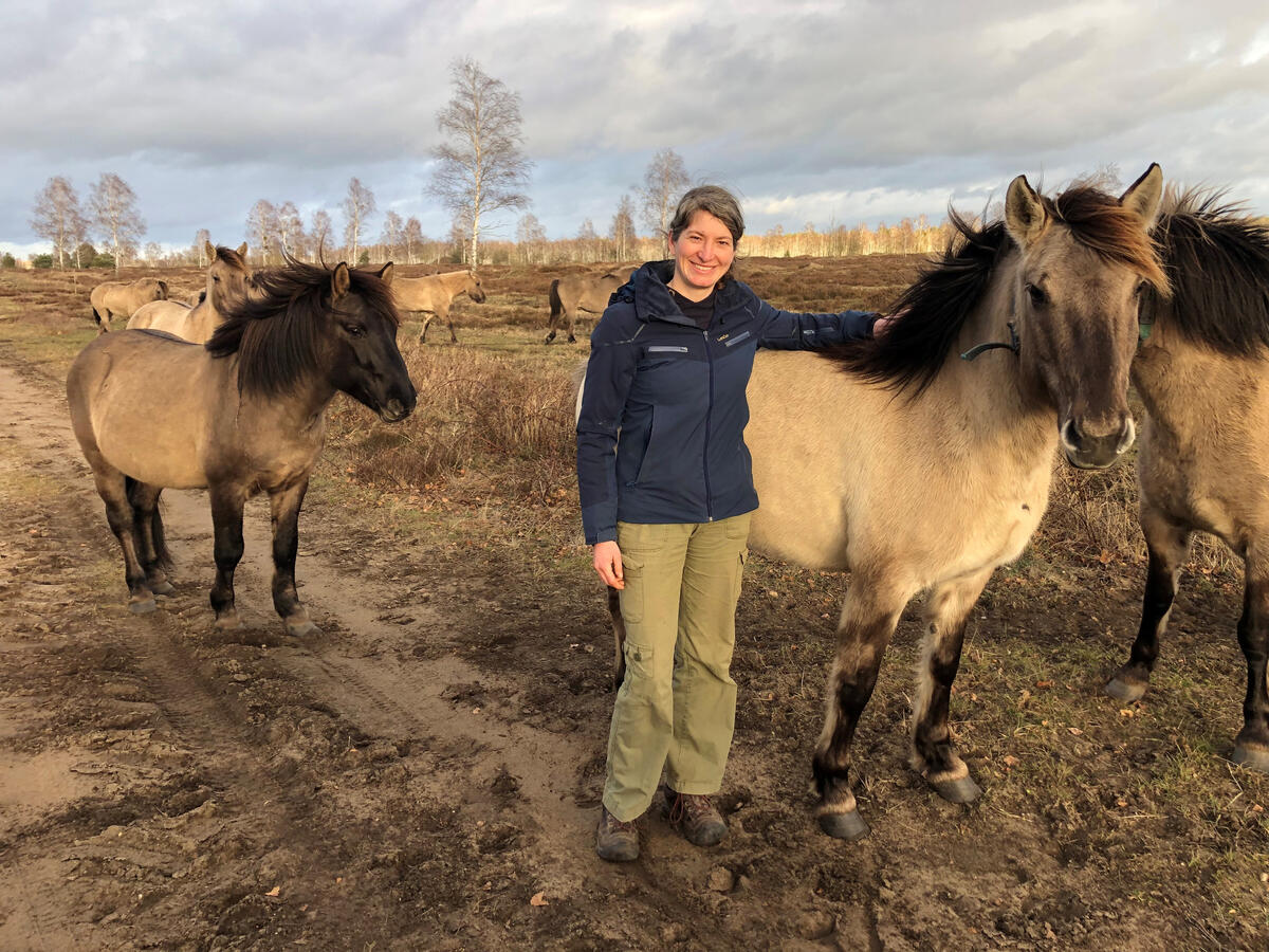 „Mein Job ist wunderbar abwechslungsreich und niemals langweilig“, schmunzelt Hönicke. Wenn sie im Herbst und Winter auf der Fläche ist, nimmt sie ein, zweimal die Woche eine Astschere oder den Freischneider zum Arbeitseinsatz mit, um junges Gehölz und Büsche zurückzuschneiden. „Sollten im Winter die Wasserstellen einfrieren oder im Sommer austrocknen, müssen wir Wasser fahren“, erläutert Hönicke weitere Arbeiten. Regelmäßig müssten auch Zäune repariert werden. „Im Sommer sind wir bis zu sechs Mal auf einer Strecke von 35 Kilometern unterwegs, um den Aufwuchs unter den Elektro-Zäunen zu mähen, damit die Technik funktioniert. Das macht wirklich viel Arbeit“, so Hönicke. Besonders am Herzen liegt der Biologin die Öffentlichkeitsarbeit. Einmal im Monat organisiert sie Veranstaltungen wie Führungen für Kinder und Erwachsene. Sechs bis achtmal im Jahr kümmert sie sich auch um die Fleischbestellungen, wenn einzelne Heckrinder aus der Herde genommen werden. Die Liste der Abnehmerinnen und Abnehmer beispielsweise für Wurst sei lang. „Der limitierende Faktor bei der Fleischvermarktung sind die Landfleischereien, die nur wenige freie Termine im Jahr anbieten können“, sagt Hönicke. Dass die Arbeit auf der Ganzjahresweide viele Jahre durch Forschungsprojekte der Hochschule Anhalt begleitet wurde, empfindet sie als Gewinn - genauso wie die Zusammenarbeit mit den Mitarbeitenden des Bundesforstbetriebes Mittelelbe und im DBU Naturerbe oder den beteiligten Behörden. Naturschutz sei eine Gemeinschaftsaufgabe. Dass dieses Projekt mithilfe aller Partner gut läuft, unterstreicht auch die Auszeichnung zum UN-Dekadeprojekt zur Wiederherstellung von Ökosystemen in diesem Jahr. Hönicke sieht die Konik-Herde antraben. Zielstrebig ziehen sie in einer langen Reihe an der Biologin vorbei. „Sie haben gerade einen Plan“, meint Hönicke. Sie weiß: „Zur Mittagszeit dösen sie gerne an einer windgeschützten Stelle.“ Als letztes verschwindet der Hengst Matthias aus dem Blickfeld, der als Schlusslicht über das Wohl der Herde wacht.