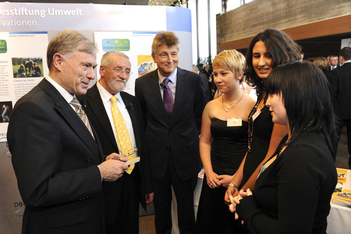 Am 24. und 25. Oktober hatte die DBU vier Entdecker-Teams des DBU-Schüler- und Jugendwettbewerbs „Entdecke die Vielfalt“ zur Verleihung des Deutschen Umweltpreises nach Augsburg eingeladen. Die Gruppen aus Biberach, Bottrop, Chemnitz und Scheinfeld hatten die Chance, einen Blick hinter die Kulissen der Veranstaltungen zu werfen und ihren Wettbewerbsbeitrag an einem Stand zu präsentieren. Nach der Verleihung des Deutschen Umweltpreises besuchte auch Bundespräsident Dr. Horst Köhler den Stand der Vielfalt-Entdecker und ließ sich die unterschiedlichen Wettbewerbsarbeiten im Gespräch mit den Jugendlichen ausführlich erklären.