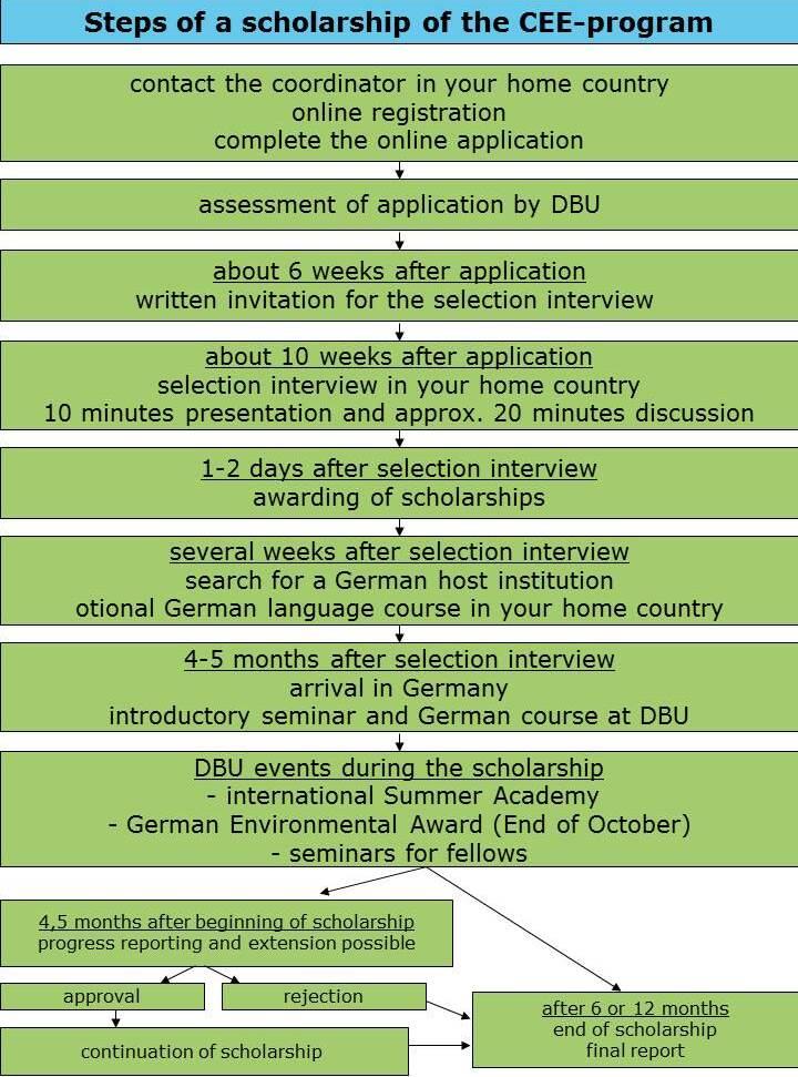 The diagram on the left side shows the process of a successful application and the fellowship in Germany. The best applicants will be chosen twice a year. The 6-12 months fellowship in Germany begins approximately six months after the selection interviews have taken place.