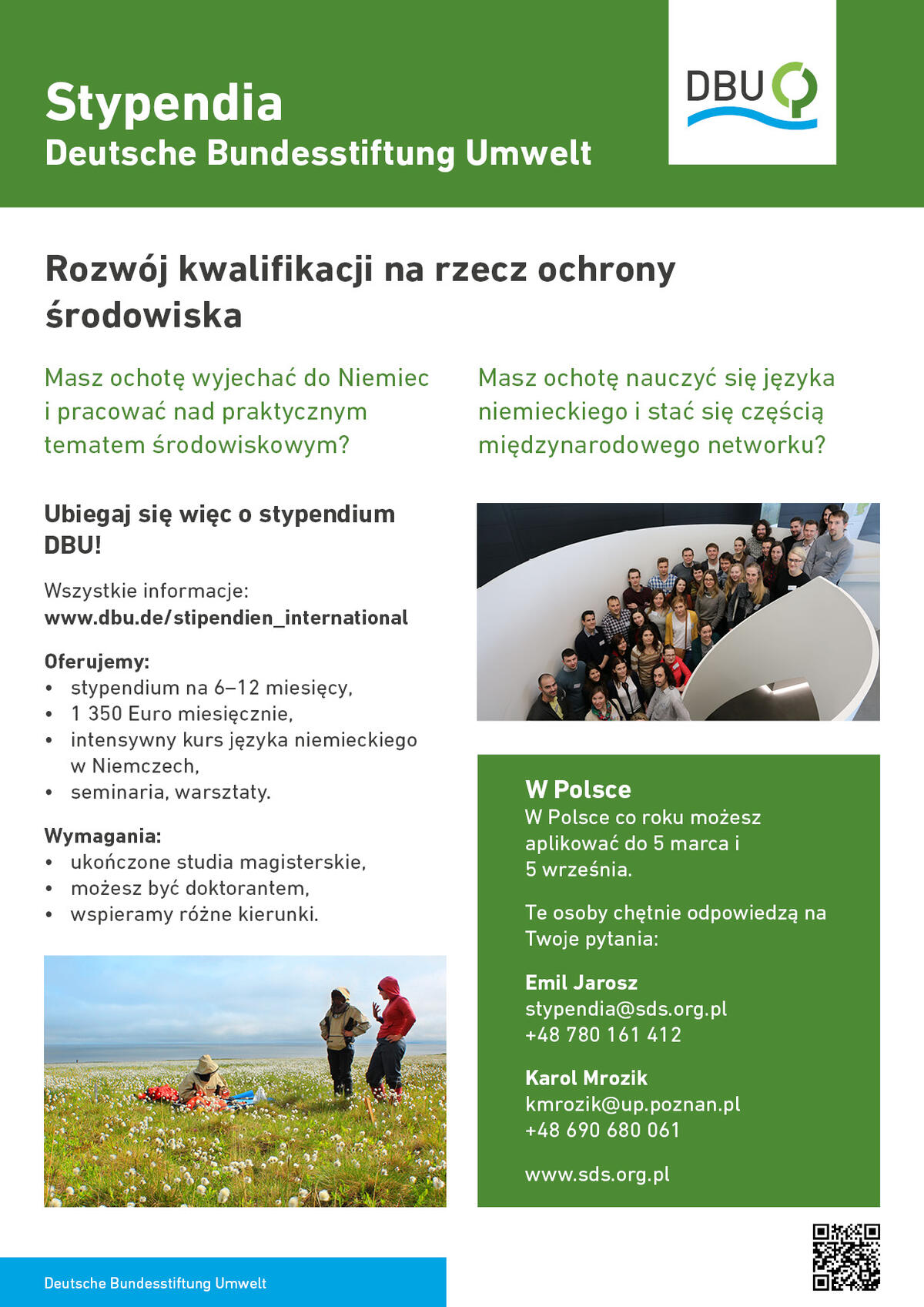 Since 2001, there is an association of former Polish fellowship holders - Stowarzyszenie Srodowisko dla Srodowiska (SdS) in Poland. The SdS supports the DBU in announcing the programme and selecting suitable fellowship holders. It helps to consolidate the network of current and former fellowship holders and to strengthen the contacts between Germans and Poles. Together with the DBU, the SdS also contributes to a socially fruitful climate between Germany and Poland.