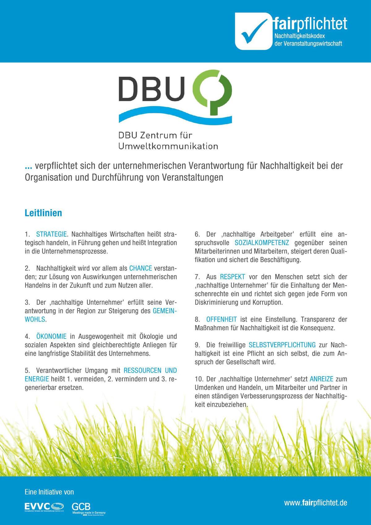 Sowohl unsere alltägliche Arbeit als auch die Durchführung von Veranstaltungen gestalten wir umweltgerecht. Dabei achten wir konsequent auf den Einsatz von Recyclingprodukten, die Einsparung von Ressourcen und eine möglichst weitgehende Wiederverwendung eingesetzter Materialien. Detaillierte Informationen erhalten Sie hier.