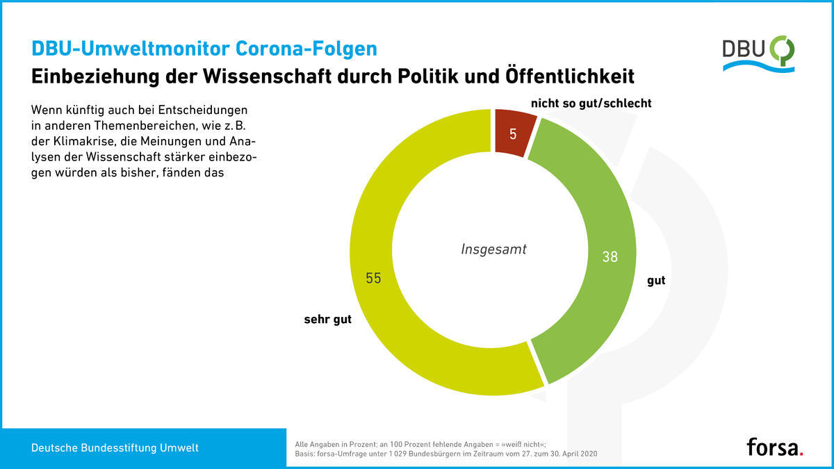 Die DBU hat in diesem Kontext eine repräsentative Umfrage des Meinungsforschungsinstituts forsa Politik- und Sozialforschung zum Thema „Nachhaltigkeit in der Corona-Krise“ durchführen lassen. Im Rahmen der Untersuchung wurden vom 27. bis 30. April 2020 insgesamt 1.029 Personen ab 14 Jahren befragt.