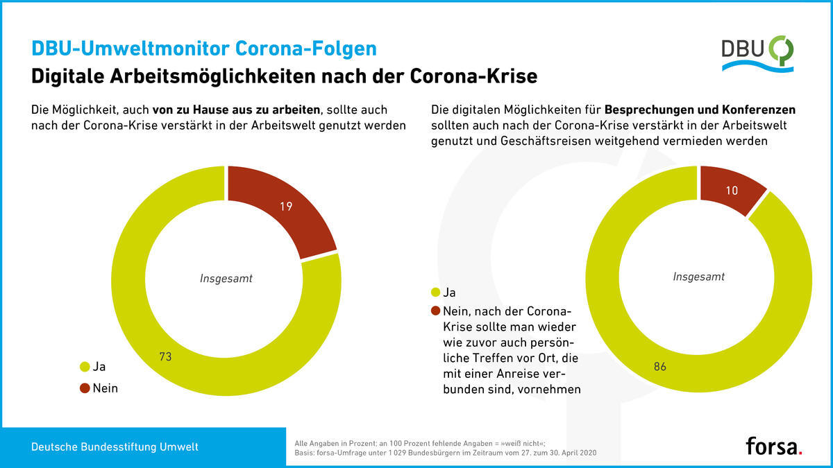 - Homeoffice als Zukunftsmodell? Eine Vielzahl an Menschen hat in den vergangenen Wochen im Homeoffice gearbeitet und statt Geschäftsreisen anzutreten, an Videokonferenzen teilgenommen. Fast drei Viertel der Bürger meinen, dass das Homeoffice auch nach der Corona-Krise verstärkt genutzt werden sollte. Genauso sprechen sich 86 % der Befragten für mehr Videokonferenzen statt Geschäftsreisen aus.