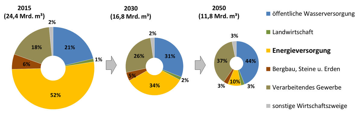 Zusammenfassend haben die Veränderungen des Energiesektors im Rahmen der betrachteten Energiewende-Szenarien einen positiven Einfluss auf den Wassersektor. Der Umfang der mengenmäßigen Wassernutzungen wird sich dadurch bis zum Jahr 2050 in Deutschland insgesamt schätzungsweise um etwa die Hälfte reduzieren. Dies ist im Wesentlichen auf den starken Rückgang der Kühlwasserentnahmen konventioneller Großkraftwerke auf Basis fossiler Energieträger sowie auch auf das Auslaufen der Braunkohleförderung zurückzuführen. Zudem wird diese Nutzungsregression durch den massiven Ausbau von Windkraft und Photovoltaik – für den Wassersektor die wohl nachhaltigsten Formen der Stromerzeugung – kaum beeinträchtigt. Auch durch die Wasserkraftnutzung und den Betrieb von Pumpspeichern werden nach den Prognosen der Energiewendeszenarien keine Veränderungen in größerem Umfang erwartet. Neben Effizienzsteigerungen von Wasserkraftwerken sowie einem begrenzt möglichen Zubau von neuen Pumpspeichern können allerdings durch die Anwendung neuer Bewirtschaftungskonzepte beim Betrieb vorhandener Wasserspeicher und -versorgungsnetze weitere die Energiewende unterstützende Dienstleistungen für den Energiesektor erschlossen werden. Gleiches gilt auch für den Bereich der öffentlichen Abwasserbehandlung. Neben nach wie vor noch vorhandenen Potenzialen zur Steigerung der Energieeffizienz und Eigenstromerzeugung bestehen auch aussichtsreiche Optionen zu Übernahme netzdienlicher Leistungen wie z. B. durch flexibles Lastmanagement und Bereitstellung von Speicherkapazitäten. Darüber hinaus stellen wasserwirtschaftliche Anlagen aufgrund ihrer flächendeckend etablierten Infrastruktur geeignete Standorte zur Integration von technischen Komponenten des Energiesystems dar, wie beispielsweise den zukünftig in erheblichem Umfang benötigten Power-to-Gas-Technologien.