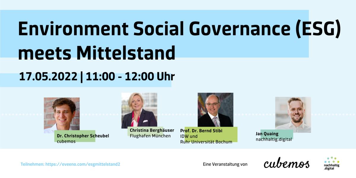 Wie wird ESG die Wirtschaft beeinflussen und wie wird es im Mittelstand umgesetzt? Welche Erfolgsfaktoren ergeben sich daraus? Wir sprechen in der Veranstaltung mit Expert*innen vom IDW, Flughafen München und cubemos.