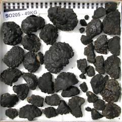 Am Morgen des 15.04. 2010 verließ das deutsche Forschungsschiff FS Sonne bei gutem Wetter und ruhiger See den Hafen von Papeete (Tahiti), um zu einem deutschen Lizenzgebiet in den nordöstlichen Pazifik zu starten. An Bord eine 25 Mann starke Besatzung und insgesamt 23 Wissenschaftler der BGR, des IFM-Geomar, des Alfred-Wegener-Instituts für Polar- und Meeresforschung und des Deutschen Zentrums für Marine Biodiversitätsforschung des Senckenberg-Instituts in Wilhelmshaven. Ziel dieser 5-wöchigen Expedition in Tiefen von 4000 m unter der Meeresoberfläche sollte dabei das Aufspüren von Gebieten reich an Manganknollen sein, die wegen ihres Gehaltes an Kupfer, Kobalt und Nickel als neue Rohstoffquelle der Zukunft gehandelt werden. Die runden bis ovalen schwarzen Knollen unterschiedlicher Größe (Abb.1) bilden sozusagen die Trüffel in der Tiefsee. Dabei gilt die Faustregel, dass Gebiete mit Belegungsdichten von 10kg/m2 wirtschaftlich abbauwürdig sind.