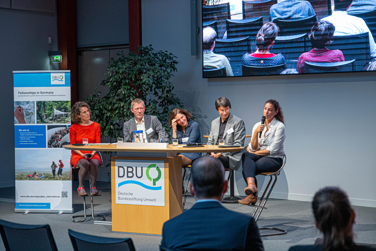 Im Anschluss folgte eine Podiumsdiskussion mit dem Titel „What is the solution to pollution? mit Prof. Bethanie Carney Almroth, Universität Göteborg, Prof. Dr. Martin Scheringer, ETH Zürich, Prof. Dr. Ralf Schulz, Universität Koblenz Landau, Dr. Martina Winker, Institut für sozial-ökologische Forschung, Frankfurt, und DBU-Alumna. Moderiert wurde die Diskussion von Julia Vismann.