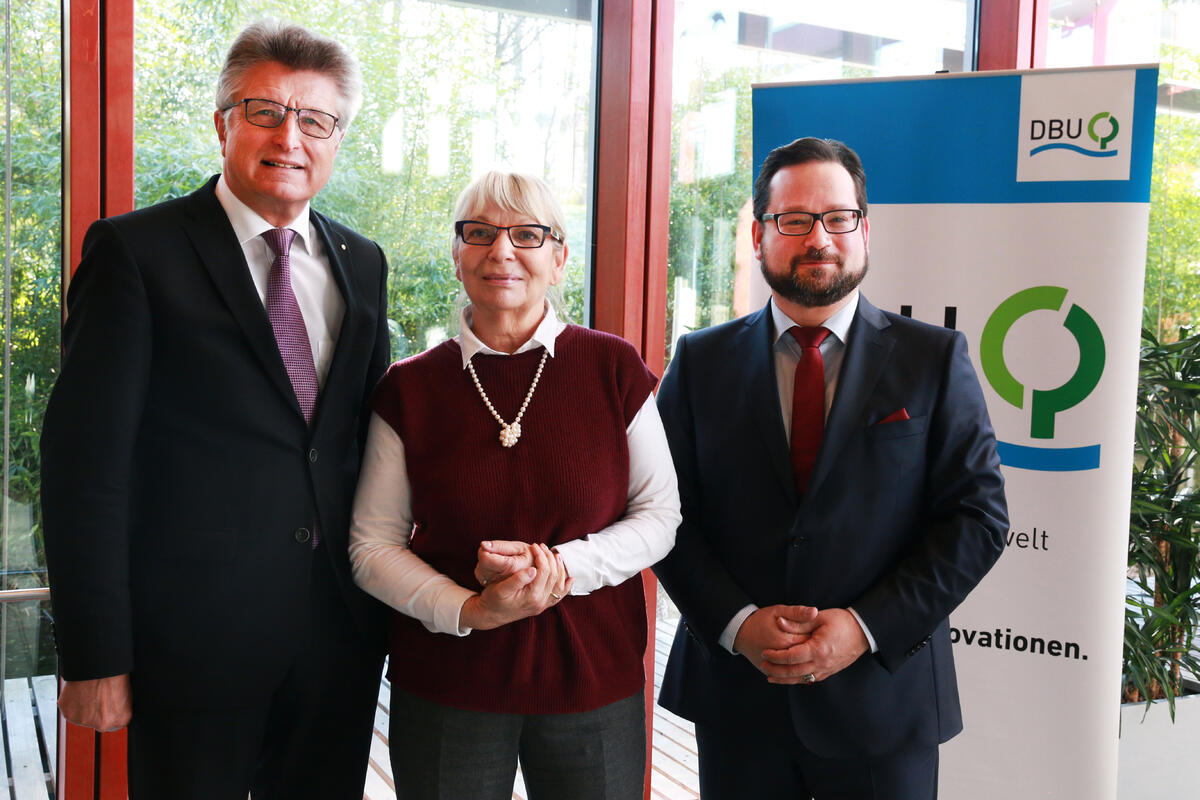 Offizieller Start bei der DBU: Alexander Bonde (rechts) wurde von der stellvertretenden DBU-Kuratoriumsvorsitzenden Undine Kurth (Mitte) in das Amt des Generalsekretärs eingeführt. Unter den Gästen: DBU-Gründungsgeneralsekretär und DBU-Kuratoriumsmitglied Dr.-Ing. E. h. Fritz Brickwedde (links)