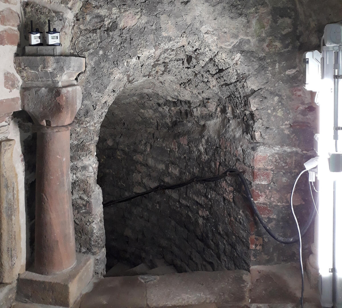 „In nahezu allen Baustoffen wurden hohe und zum Teil sogar extreme Gehalte an bauschädlichen Salzen nachgewiesen. Insbesondere das viele Schwefeldioxid, das vermutlich durch die Luftverschmutzung eines nahegelegenen Industriegebiets verursacht wurde, hat großen Schaden angerichtet“, berichtet Constanze Fuhrmann, DBU-Referentin für Umwelt und Kulturgüter. Durch die ehemalige Nutzung als Sickergrube haben sich außerdem Nitratsalze in Sandstein und Putzen angereichert. Hinzu kommen Alkali- und weitere Sulfatbelastungen durch Reparaturen mit zementgebundenen Mörteln und Betonen. Zusammen mit der hohen beziehungsweise wechselnden Luftfeuchtigkeit kam und kommt es zu Kristallisationsprozessen der eingetragenen Salze. Obendrein führt die hohe Luftfeuchtigkeit zu einem intensiven Wachstum von Bakterien und Schimmelpilzen, sodass sich auf den Oberflächen Beläge bilden.