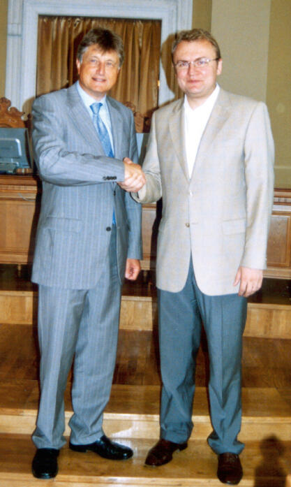 DBU-Generalsekretär Dr. Fritz Brickwedde (links) übergab dem Oberbürgermeister von Lemberg, Andrij Sadovyj, Mitte August die Förderzusage der Deutschen Bundesstiftung Umwelt (DBU) für das Gemeinschaftsprojekt der drei Städte.