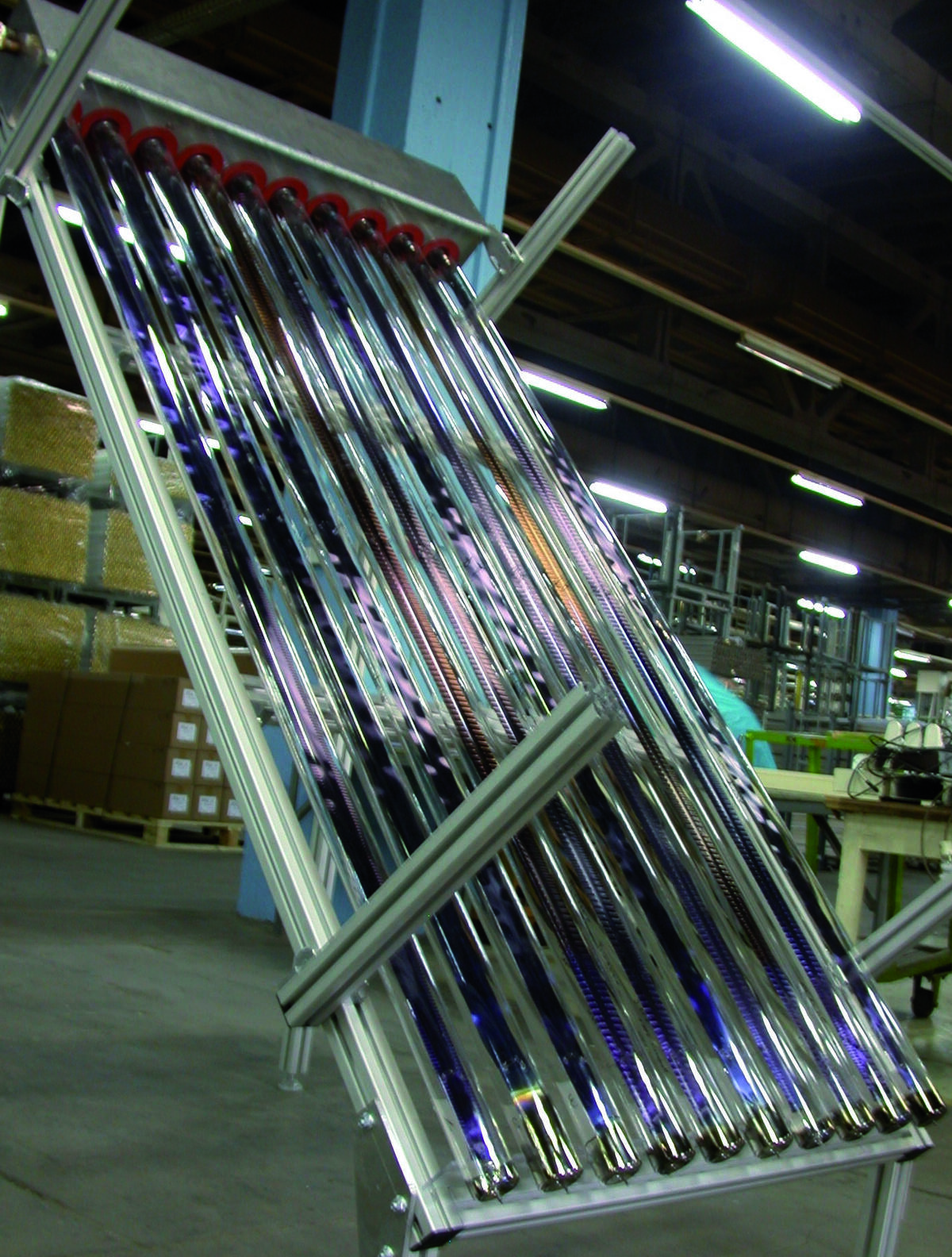 Dazu musste das Fensterglas allerdings erst mit einer speziellen Beschichtung versehen werden, die verhindert, dass das Glas durch den Kontakt mit Wasser verwittert. Die Beschichtung trägt darüber hinaus dazu bei, dass das Sonnenlicht weniger stark reflektiert wird. Ein Novum ist auch der vakuumdichte Verschluss der Kollektorröhre. Die Firma entwickelte hierfür eine neuartige Glas-Metall-Verbindung, die zum einen ein langlebiges Vakuum sichert, zum anderen den Solarabsorber im Inneren der Röhre fixiert. Auf ihrer neuen Produktionsanlage will das Unternehmen bis zu 600 Kollektoren pro Stunde herstellen.