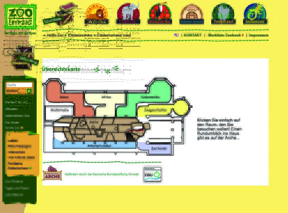 mit Themen des Artenschutzes und einer nachhaltigen Lebensweise auf drei Kontinenten vertraut gemacht werden können, ist das Projekt »Entdeckerhaus Arche« der Zoo Leipzig GmbH. Im Zentrum der Aktivitäten im ehemaligen Raubtierhaus steht eine Besucherausstellung. Erwachsene, Jugendliche und Kinder können hier die Begleitung durch so genannte »Zoo-Lotsen« in Anspruch nehmen. Diese persönliche Vermittlungsform durch Experten der Umweltbildung wird sowohl von Schulklassen als auch von Familien und Erwachsenengruppen geschätzt.