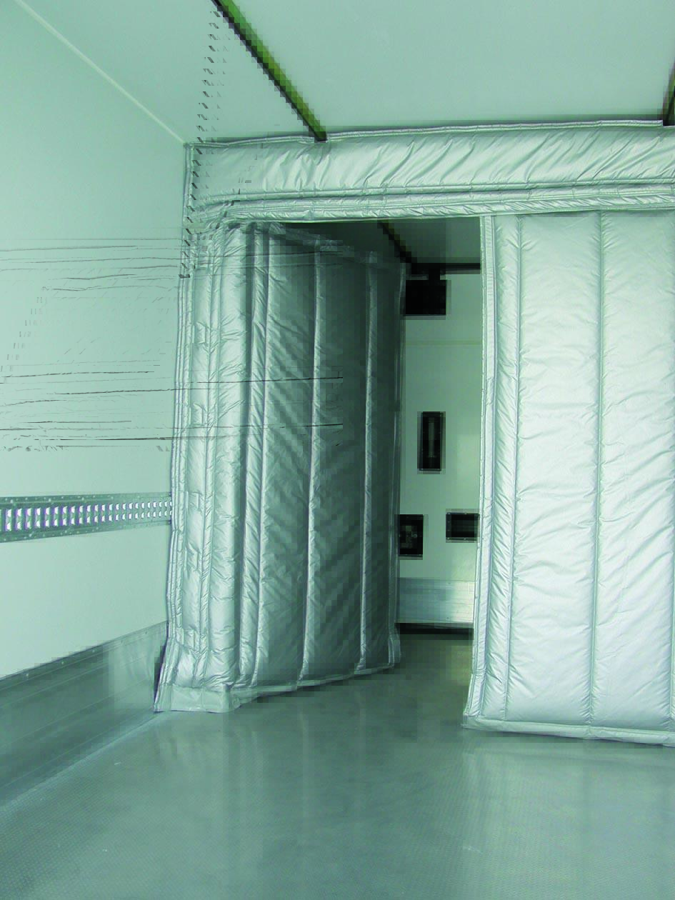 Die Kiesling Fahrzeugbau GmbH (Dornstadt) hat eine verschiebbare Trennwand mit Pendeltüren entwickelt, die einen Warmlufteinfall wirksam minimiert. Sie besteht aus einer neuartigen Materialkombination mit Hohlkammerfasern. Dadurch können ähnlich hohe Wärmedämmwerte erreicht werden wie bei Fahrzeugwänden. Eine Linearführung ermöglicht das Verschieben der Trennwände entsprechend der Laderaumnutzung. Leerraum und rücktransportierte Leerverpackung werden nicht mitgekühlt. Zugleich wird die Hygiene verbessert.