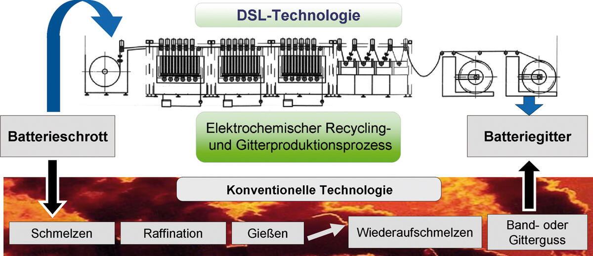 Die DSL Dresden Material Innovation (DSL) entwickelte eine vollkommen neuartige Technologie, die aus Bleischrott und dem verbrauchten Aktivmaterial in einem einzigen Verfahrensschritt neue und technisch verbesserte Batteriegitter herstellt. Diese ökologische und ökonomische Innovation verursacht keine CO
