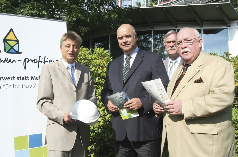 Der Präsident des Zentralverbandes des Deutschen Handwerks (ZDH), Otto Kentzler (2. v. l.), zeigte sich bei seinem Besuch Ende August in der DBU-Geschäftsstelle in Osnabrück begeistert vom Erfolg der aktuellen Infokampagne »Haus sanieren - profitieren!«. Kern der Kampagne ist ein kostenloser Energie-Check für Hausbesitzer. Bereits in der Pilotphase haben sich über 1.000 Kooperationspartner zu Schulungen in den Handwerkskammerbezirken Osnabrück-Emsland und Münster angemeldet. Damit gibt es laut ZDH-Präsident Kentzler gleich drei Gewinner: Das Klima, weil weniger Energie verbraucht wird, Besitzer und Mieter, weil sie Geld sparen, und das Handwerk mit mehr Aufträgen und Beschäftigung. Der ZDH-Präsident wurde in Osnabrück von (v. l.) DBU-Generalsekretär Dr.-Ing. E. h. Fritz Brickwedde, Dr. Heinz-Gert Schlenkermann, Hauptgeschäftsführer der Handwerkskammer (HWK) Osnabrück-Emsland und HWK-Präsident Karl-Heinz Brünger begrüßt.