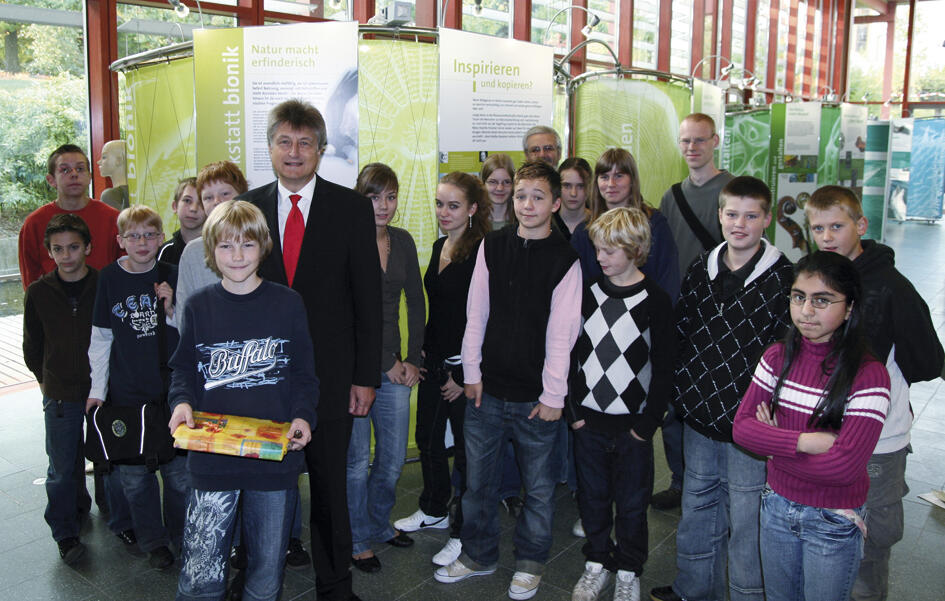 Als 20.000ster Besucher der Ausstellung »Inspiration Natur - Patentwerkstatt Bionik« nahm Lars Swoboda, Schüler des Ernst-Moritz-Arndt Gymnasiums aus Osnabrück, als Präsent ein Buch über Bionik und einen Salzstreuer von DBU-Generalsekretär Dr.-Ing. E. h. Fritz Brickwedde in Empfang. Brickwedde erinnerte daran, dass der Salzstreuer das erste bionische Patent in Deutschland gewesen und nach dem Vorbild der Mohnblume entwickelt worden sei. Die Ausstellung von DBU und Bionik-Kompetenz-Netz BIOKON ist noch bis Ende April im ZUK der DBU zu sehen.