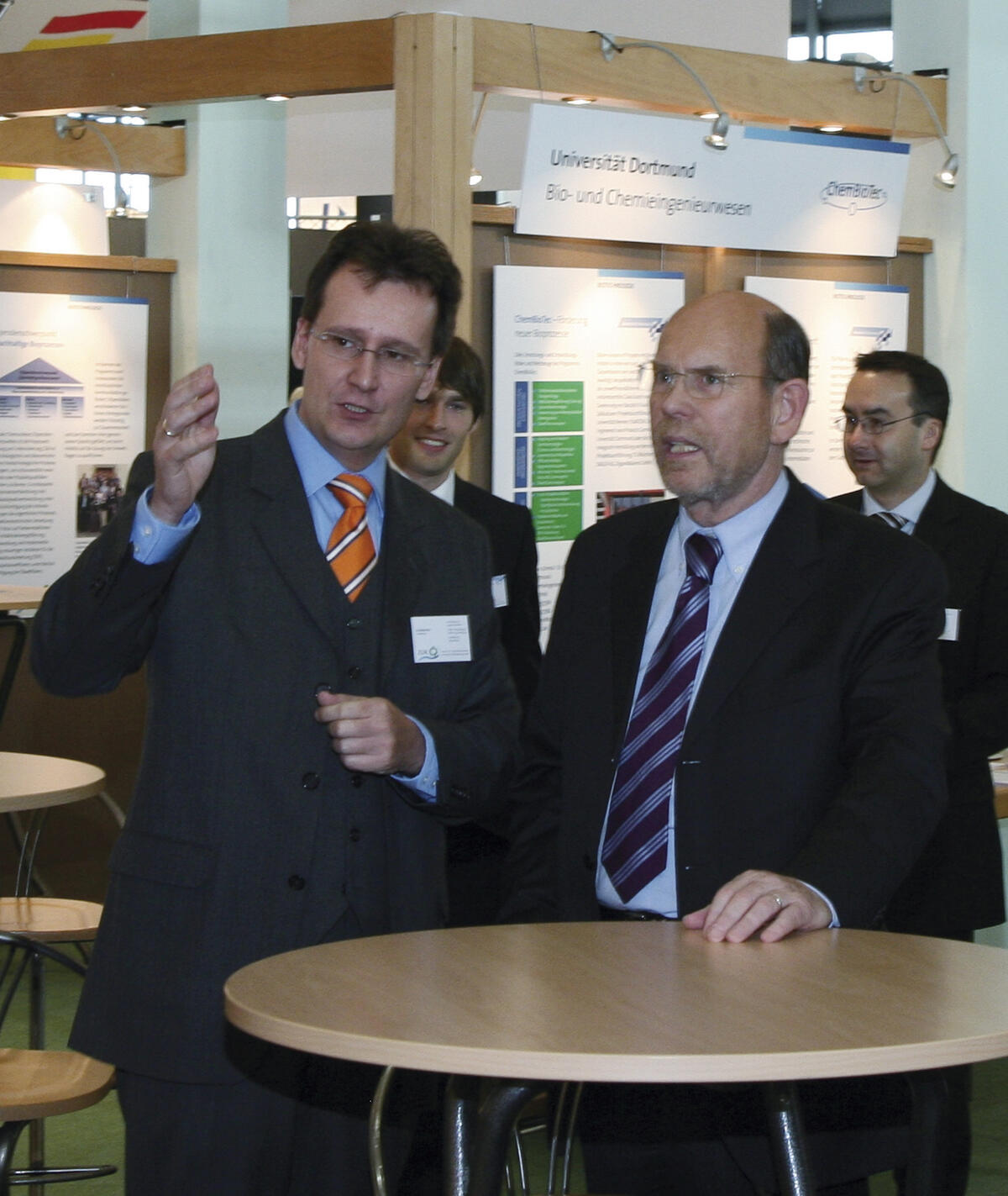 Mehr als 860 Aussteller aus 32 Nationen boten den rund 13.000 Besuchern der Biotechnica Anfang Oktober in Hannover einen umfassenden Überblick über die europäische Biotechnologie-Branche. Unterstützt von sechs Mitausstellern präsentierte die DBU biotechnologische Innovationen für den Umweltschutz. Neben zahlreichem Fachpublikum besuchten Niedersachsens Finanzminister Hartmut Möllring, der niedersächsische Wirtschaftsminister Walter Hirche (rechts) sowie der Staatssekretär im niedersächsischen Agrarministerium, Friedrich-Otto Ripke, den DBU-Messestand und waren beeindruckt von den Förderprojekten. Links: Projektleiter Dr. Rainer Erb, Zentrum für Umweltkommunikation der DBU.