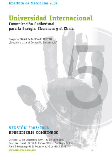 Die Internationale Sommeruniversität 2007/2008 »Audiovisuelle Kommunikation Erneuerbarer Energien und Energieeffizienz« Chile-Deutschland zielt auf die Vermittlung audiovisueller Gestaltungskompetenz zur professionellen Kommunikation von Themen nachhaltiger Entwicklung. Die Teilnehmer lernen, Medienprodukte wie Kurzfilme, Werbe- und Radiospots, Web 2.0-Formate und Kommunikationskampagnen zu entwickeln - von der Konzeption bis zur Produktion. Die Sommeruniversität besteht aus einer Präsenzphase (Januar 2008 in Chile) und online-gestützten Selbststudienphasen (Dezember 2007 und Februar-April 2008).