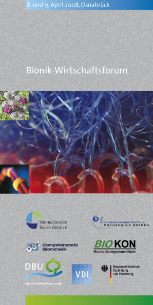 Im Mittelpunkt des Bionik-Wirtschaftsforums am 8./9. April 2008 im Zentrum für Umweltkommunikation (ZUK) der DBU stehen drei Workshops (Oberflächen, Werkstoffe und Optimierung), die das Thema »Bionik in der Industrie – Erfolgsbeispiele, Marktpotenziale und Herausforderungen« am Beispiel markanter Projekte behandeln. Der Kongress wird von der DBU in Kooperation mit dem BMBF-geförderten Bionik-Kompetenz-Netz e. V. BIOKON, dem Verein Deutscher Ingenieure VDI, dem Internationalen Bionik-Zentrum – Stiftung für Bionik sowie dem regionalen Bionik-Netzwerk Biomimetik aus Baden-Württemberg und dem Bionik-Innovations-Centrum der Hochschule Bremen veranstaltet. An der Tagung in Osnabrück, bei der auch der Bionic Award 2008 verliehen wird, nehmen alle wesentlichen Akteure der Bionik in Deutschland teil.