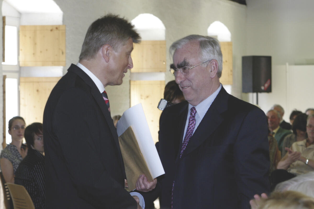 Herzliche Glückwünsche zum 70. Geburtstag von Bundesfinanzminister a. D. Theo Waigel (rechts) überbrachte DBU-Generalsekretär Dr.-Ing. E. h. Fritz Brickwedde (links) anlässlich der Ausstellungseröffnung »Die Augenbraue« im Zentrum für Familie, Umwelt und Kultur des Klosters Roggenburg. Brickwedde bescheinigte dem Jubilar, mit der Gründung der DBU im Jahre 1990 eine »Pioniertat« zum Wohle des Umweltschutzes in Deutschland vollbracht zu haben. Knapp 1,3 Milliarden Euro für rund 7.300 Umweltprojekte – das ist eine Bilanz in der mittlerweile fast zwanzigjährigen Geschichte der DBU, die eng mit der Person Theo Waigel verknüpft ist, lobte Brickwedde in seiner Laudatio. Dass die DBU ihr Stiftungsvermögen von 1,25 Mrd. Euro (1991) auf 1,8 Mrd. Euro steigern konnte, wurde vom ehemaligen Bundesfinanzminister mit einem hörbaren »Bravo« kommentiert.