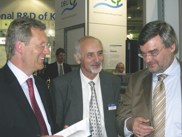 Über die neuesten Entwicklungen in Sachen ökologischer Umbau der Wirtschaft informierten sich Niedersachsens Ministerpräsident Christian Wulff (links) und Umweltminister und DBU-Kuratoriumsmitglied Hans-Heinrich Sander (nicht im Bild) am Stand der DBU auf der diesjährigen Hannover Messe. Besonderes Interesse bei Besuchern und Experten fanden die neu entwickelten Kohlebriketts aus pflanzlichen Reststoffen der hessischen Firma Willi Schlitt – ebenso die Forschung der Hochschule Ostwestfalen-Lippe zu Pflanzenkohle. Am Gemeinschaftsstand der DBU präsentierten sich insgesamt neun innovative Projekte, die sich durch wirkungsvollen Energieeinsatz in industriellen Prozessen auszeichnen und damit zum Klimaschutz beitragen. Im Gespräch mit Ministerpräsident Wulff sind Peter Lippert (Mitte) von der Firma Pentagal aus Bochum und Prof. Dr.- Ing. Hans-Günter Ramke (Hochschule Ostwestfalen-Lippe).