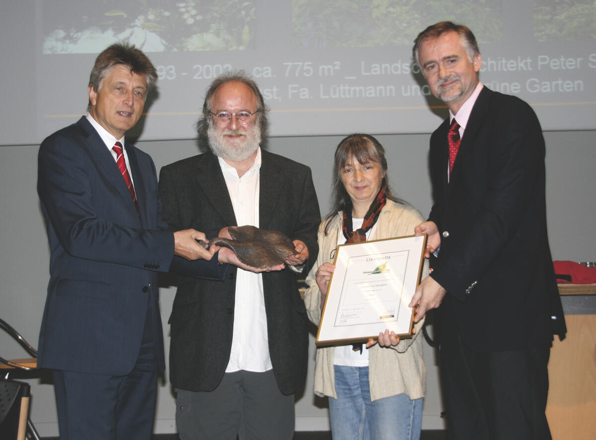 Zum Gesamtsieger ist das »lutz Therapiezentrum« am Osnabrücker Jahnplatz gekürt worden. DBU-Generalsekretär Dr.-Ing. E. h. Fritz Brickwedde (links) und Stadtbaurat Wolfgang Griesert (rechts) zeichneten die siegreichen Firmeninhaber Michael Weinmann und Ute Hildebrand mit einer Bronzeskulptur aus.