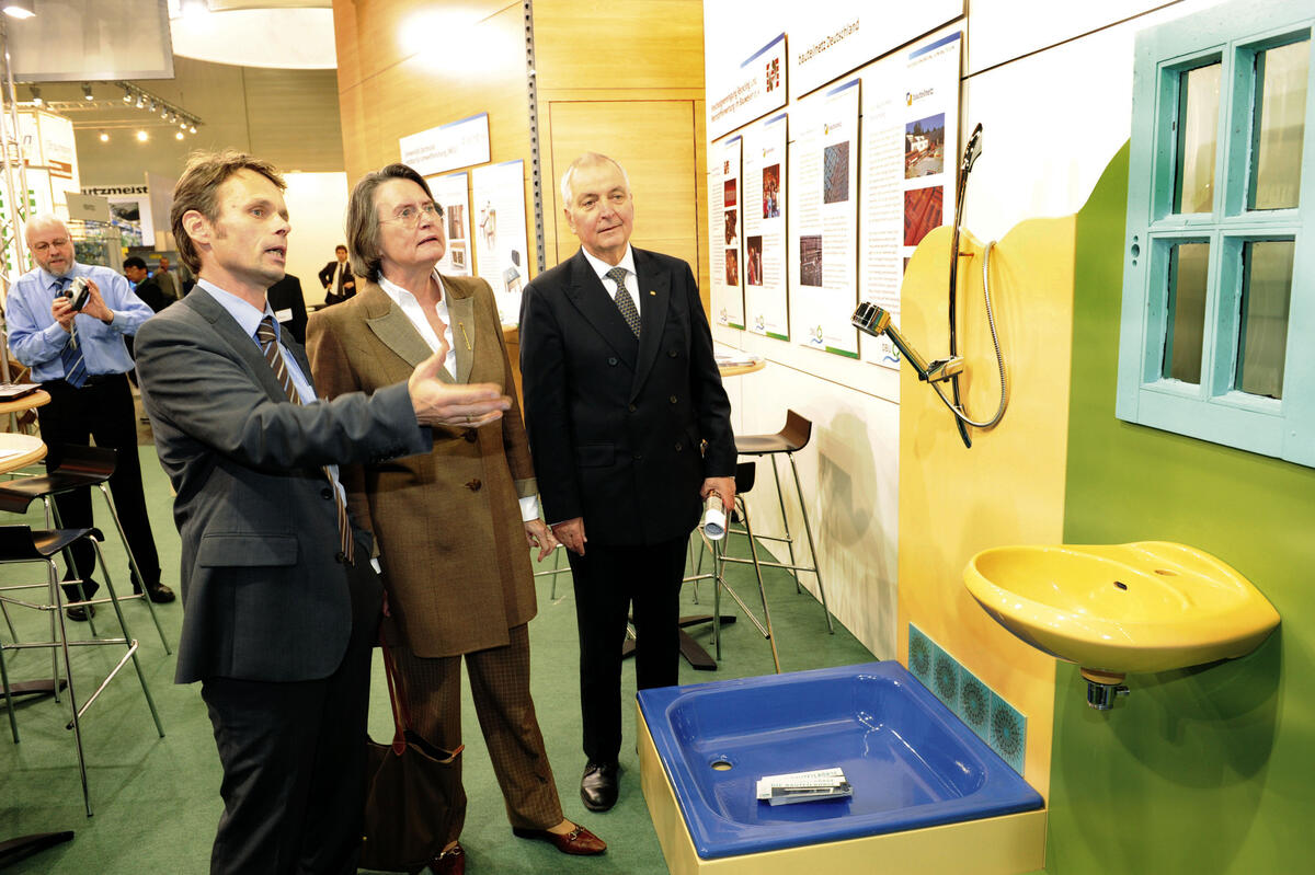 Auf der diesjährigen »Entsorga-Enteco«, der internationalen Fachmesse für Kreislaufwirtschaft und Umwelttechnik, präsentierte die DBU zusammen mit sechs Partnern innovative Projekte zur Wiederverwendung und zum Recycling rund um das Thema Bauen. Darüber unterrichteten sich am DBU-Stand in Köln auch die Wirtschaftsministerin von NRW, Christa Thoben (Mitte), sowie der ehemalige Bundesumweltminister Klaus Töpfer (rechts), die von Projektleiter Ulf Jacob (links) informiert wurden. Knapp 800 Unternehmen aus 30 Ländern waren Ende Oktober auf der Messe vertreten; 36.000 Fachbesucher aus 90 Ländern wollten die Ausstellung sehen. Die nächste Messe unter dem neuen Namen »Enteco« wird sich im Juni 2011 auf die Themen Rohstoff- und Energierückgewinnung konzentrieren.