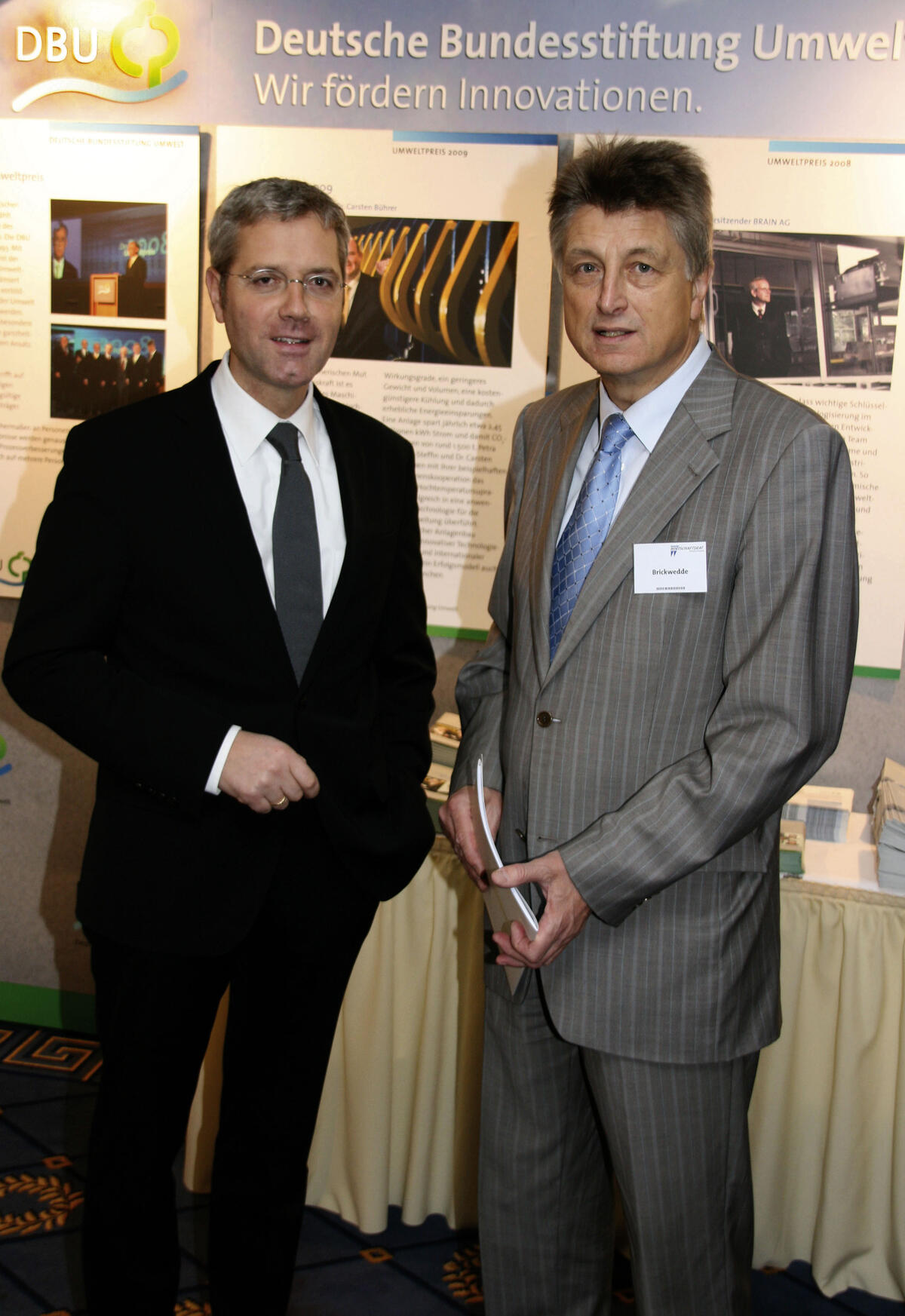 Am Rande der Tagung »Kompetenzzentrum Deutschland – Neues Wachstum durch Innovationen« des Wirtschaftsrats Ende November informierte sich Bundesumweltminister Dr. Norbert Röttgen (links) am Stand der DBU. Generalsekretär Dr.-Ing. E. h. Fritz Brickwedde (rechts) hob besonders die Innovationskraft kleiner und mittlerer Unternehmen im Umwelt- und Klimaschutz hervor. In seiner Rede machte Röttgen deutlich, dass es für den Wirtschaftsstandort Deutschland von zentraler Bedeutung sei, ambitionierte Ziele im Klimaschutz durchzusetzen. Solche anspruchsvollen Ziele würden die in vielen Bereichen weltweit führende deutsche Umwelttechnikbranche stärken und dadurch neue Innovationen und qualitatives wirtschaftliches Wachstum hervorbringen.
