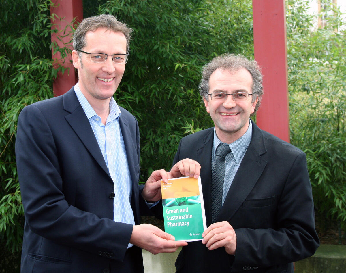 Rund 50 internationale Fachleute aus der Chemie, der Pharmazie und dem Gesundheitswesen waren der Einladung der DBU Ende Februar zu der englischsprachigen Fachtagung »2nd International Conference on Sustainable Pharmacy – Incentives and Perspectives« ins Zentrum für Umweltkommunikation (Osnabrück) gefolgt. Zu der Veranstaltung hatte die weltweit größte Umweltstiftung – bereits zum zweiten Mal nach 2008 – zusammen mit dem Institut für sozial-ökologische Forschung (Frankfurt/Main), dem Universitätsklinikum Freiburg und viamedica – Stiftung für eine gesunde Medizin (Freiburg) eingeladen. »Beim Umgang mit Arzneimitteln ist vor allem das Schaffen eines Problembewusstseins bei Ärzten, Apothekern und Patienten ein wichtiges zukünftiges Handlungsfeld«, erklärt Dr. Maximilian Hempel (links), Leiter des DBU-Referates Umweltchemie. Hempel ist zusammen mit Prof. Dr. Klaus Kümmerer (rechts), Leiter der Sektion Angewandte Umweltforschung Universitätsklinikum Freiburg, Herausgeber des Fachbuches »Green and Sustainable Pharmacy«, das anlässlich der Tagung angekündigt wurde.