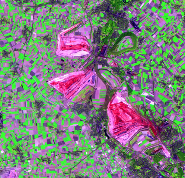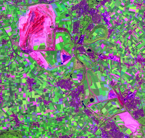 Ausgewählte Raumbeispiele führen in die jeweilige Thematik ein. Satellitenbildaufnahmen zu verschiedenen Zeitpunkten und in unterschiedlichen Darstellungen dienen dabei der Visualisierung und sind Ausgangspunkt für Fragen über den Raum und die raumprägenden Prozesse. Der Vergleich von Satellitenbildern des Rheinischen Braunkohleabbaus ermöglicht beispielsweise einen Einblick in die