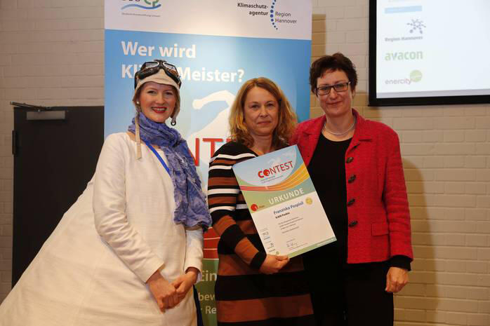 Die neue Klima-Meisterin der Region Hannover heißt Franziska Pospisil. Die Hannoveranerin aus Döhren sicherte sich den Titel in der Bürger-Wertung des Klima-CO2NTEST mit einer deutlichen Verbesserung ihrer CO2-Bilanz. Nicht nur die Bürgerinnen und Bürger konnten den Titel »Klima-Meister« erringen, auch Städte und Gemeinden traten in einer eigenen Kommune-Wertung zum Wettbewerb an. Klima-Meister der Saison 2015 dürfen sich in ihren Kategorien nun Ronnenberg, Springe und Gehrden nennen. Im Kommunenwettbewerb gingen zum ersten Mal mit Ausnahme von Hannover selbst alle Städte und Gemeinden aus der Region an den Start. Die Preisträger erhielten die Medaillen aus den Händen von DBU-Referentin Verena Exner. Die DBU unterstützt die dreijährige Pilotphase des Wettbewerbs finanziell und mit Expertenwissen.