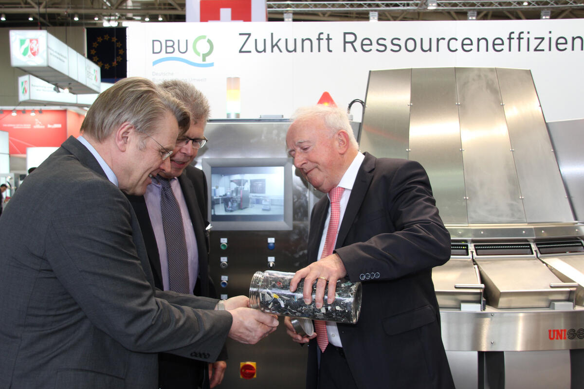 Zukunft Ressourceneffizienz– unter diesem Motto stand der diesjährige Auftritt der DBU auf der Hannovermesse im April. Als Mitaussteller auf dem zentralen Messestand des Vereins Deutscher Ingenieure (VDI) zeigten die DBU und der Träger des DBU Deutschen Umweltpreises, Prof. Dr. Gunther Krieg (UNISENSOR Sensorsysteme GmbH, Karlsruhe) eine hocheffiziente Recyclingtechnologie, die neue Potenziale für die sortenreine Wiederverwendung von Kunststoffen erschließt. Dieses auf Laserspektroskopie basierendes Sortiersystem trennt auch bisher nicht separierbare Kunststoffe mit höchster Präzision und Geschwindigkeit. Auf diese Weise lassen sich nun auch schwarze bzw. dunkle Kunststoffe anhand ihres optischen Spektrums eindeutig erkennen und sortenrein sortieren. Darüber hinaus präsentierte die DBU in mehreren Talkveranstaltungen – unter anderem mit DBU-Generalsekretär Dr. Heinrich Bottermann – ihre neuen Förderleitlinien. Mehr zu den neuen Förderthemen findet sich unter: