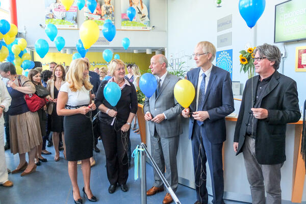 Eine neue Ausstellung zum interaktiven Kennenlernen erneuerbarer Energien zeigt das Breslauer Forschungszentrum EIT+ seit Anfang September im »Humanitarium«. Zahlreiche Installationen präsentieren dort auf praktische Weise Wissenswertes über Sonnen-, Wasser- und Windkraft sowie Geothermie. Die von der DBU finanzierte Ausstellung entstand dank Mitwirkung des Breslauer Forschungszentrums EIT+ und der Pädagogischen Ideenwerkstatt BAGAGE e. V. aus Freiburg. Das Projekt zeigt an praktischen Beispielen, wie die Energiegewinnung der Zukunft aussehen kann. Dr. Ulrich Witte (2. v. r.), Leiter der DBU-Abteilung Umweltkommunikation, hob in seiner Ansprache besonders die räumliche Nähe dieser Experimentierwerkstatt zu den Forschungslaboren des EIT+ hervor. Das Vorhaben setzt sich zum Ziel, junge Besucher auf spielerische Weise zum weiteren »erwachsenen« Forschen zu animieren. Die DBU engagiert sich in Polen mit insgesamt 170 Projekten, die meisten davon in Niederschlesien.